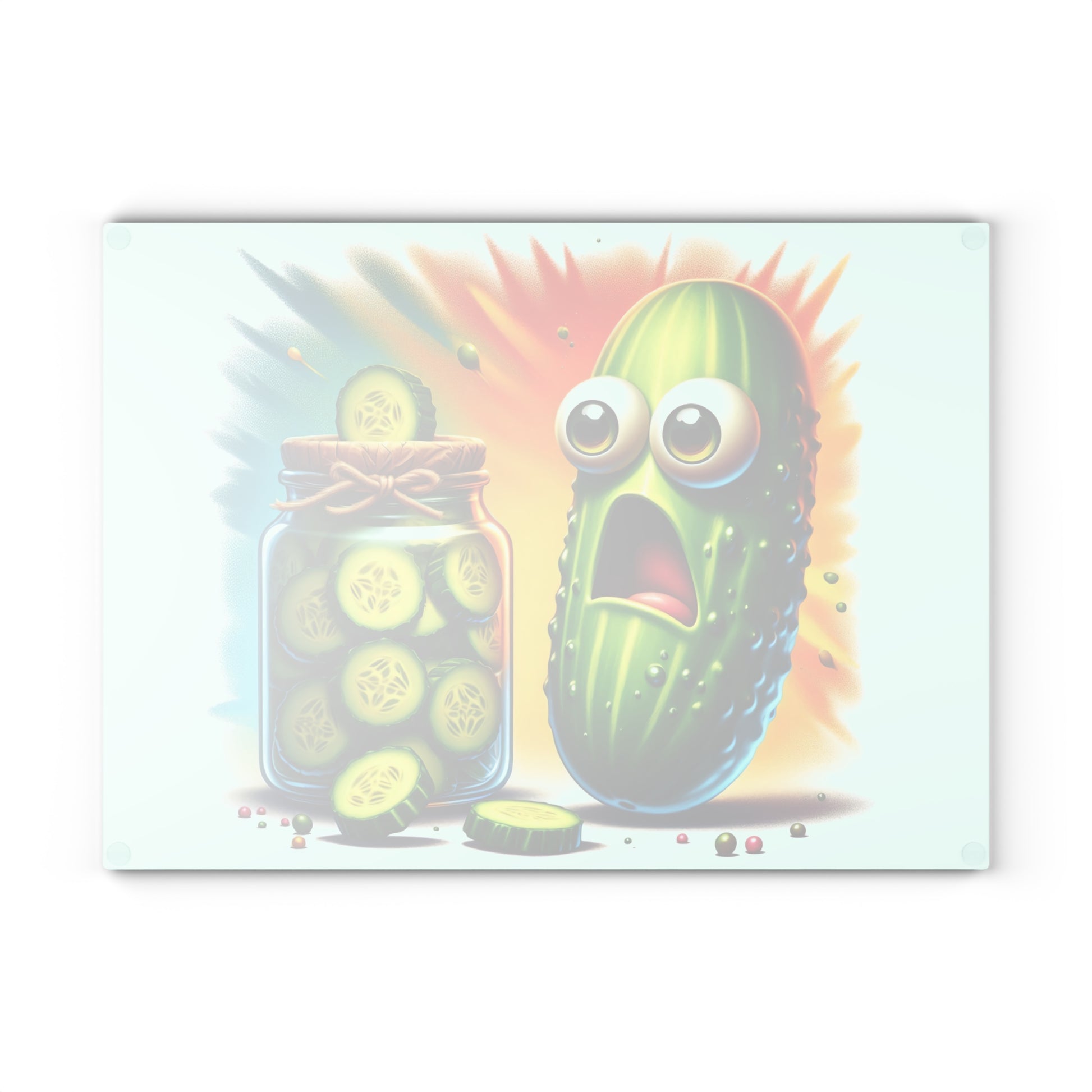 Bring laughter straight to your countertop with this hilarious pickle-themed glass cutting board! Featuring a bright, expressive pickle and vibrant splash background, this playful design adds instant cheer to meal prep, serving, or countertop display. It’s the perfect way to show off your fun personality while upgrading your kitchen with something bold, unique, and full of character.