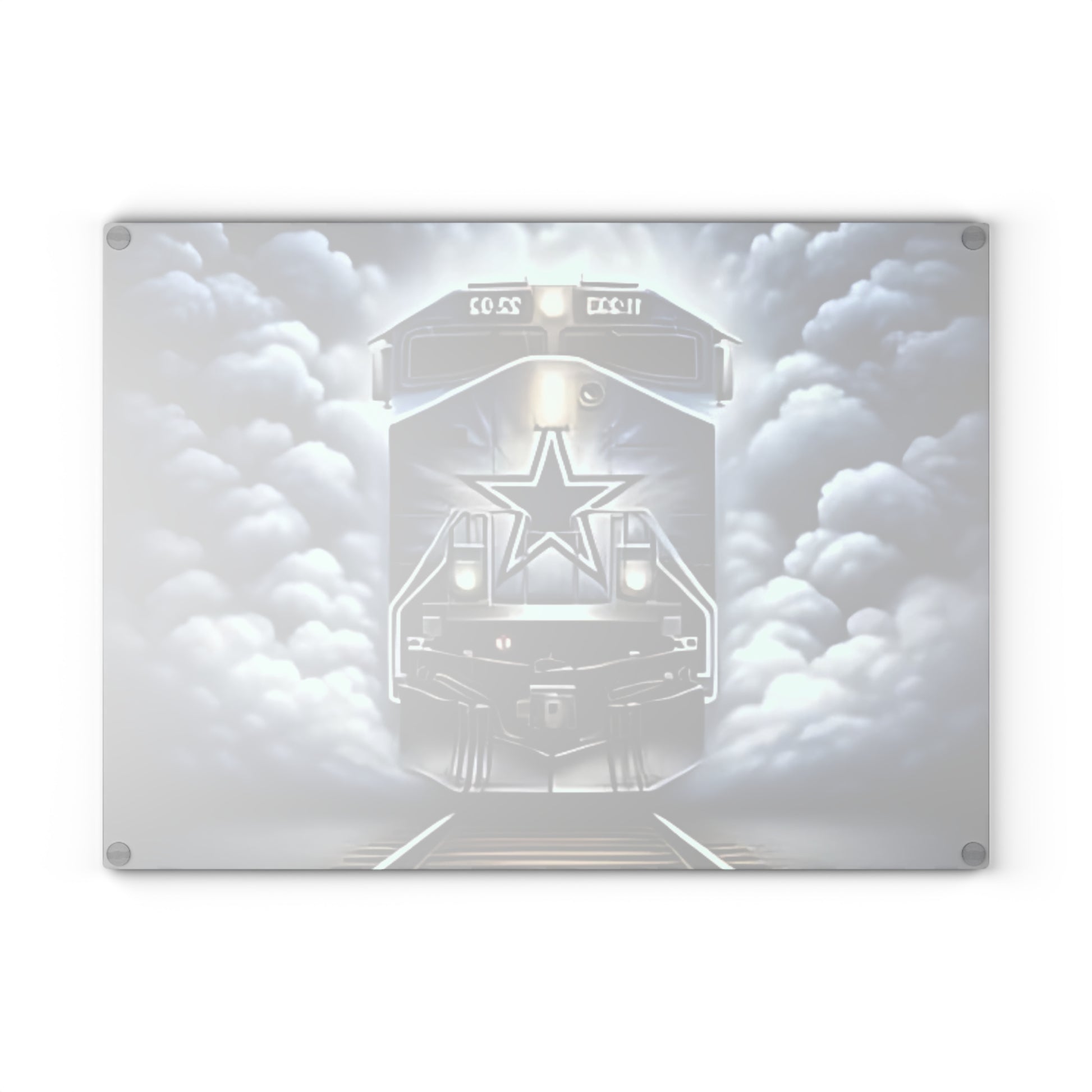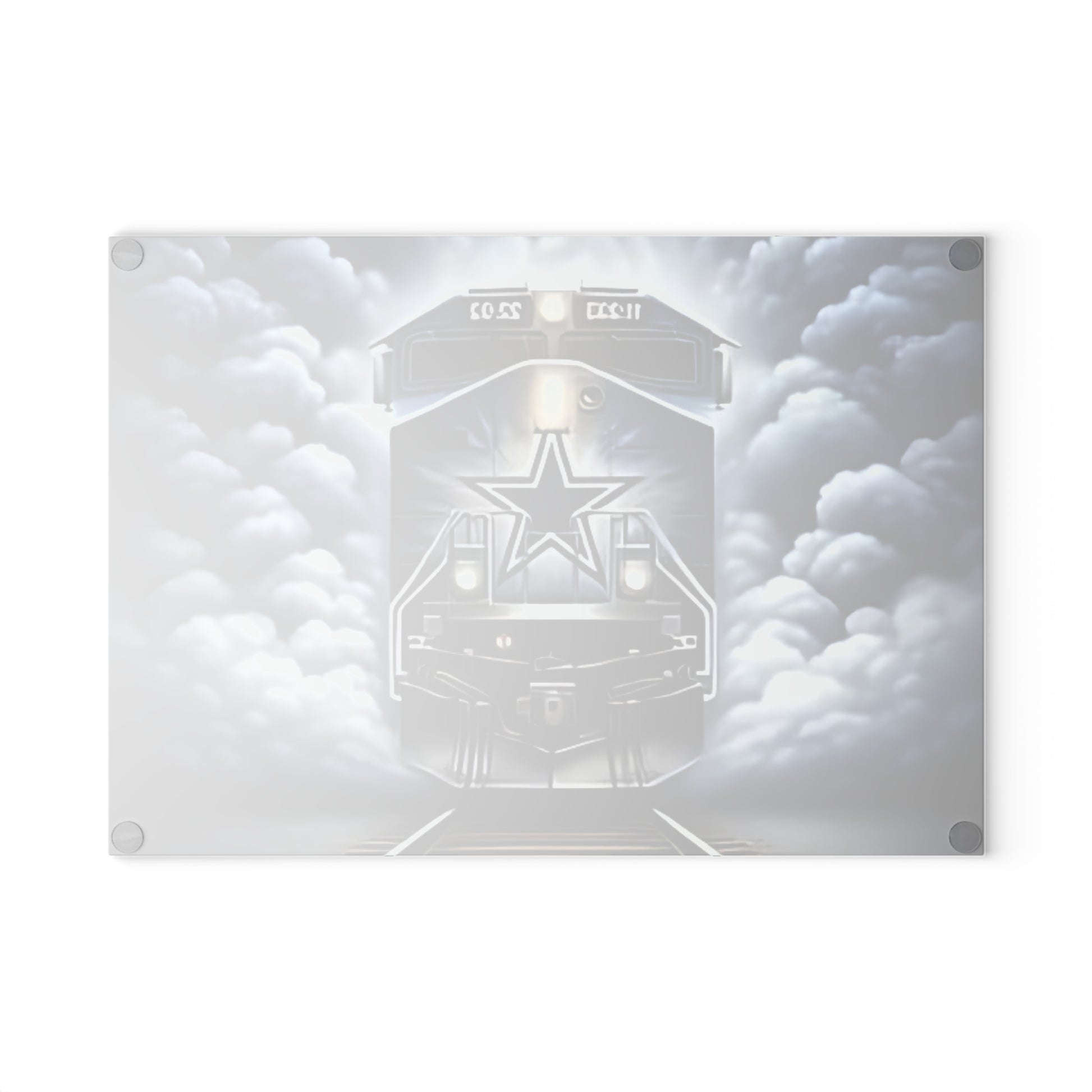 🚂 Blue & Silver Express Glass Cutting Board – Sleek Train Art Kitchen Accent