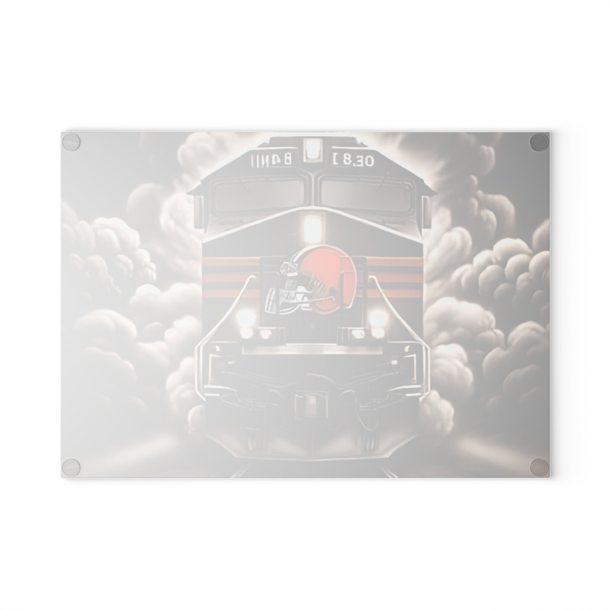 Brown & Orange Express Glass Cutting Board – Classic Train Design for Warm Rustic Kitchens