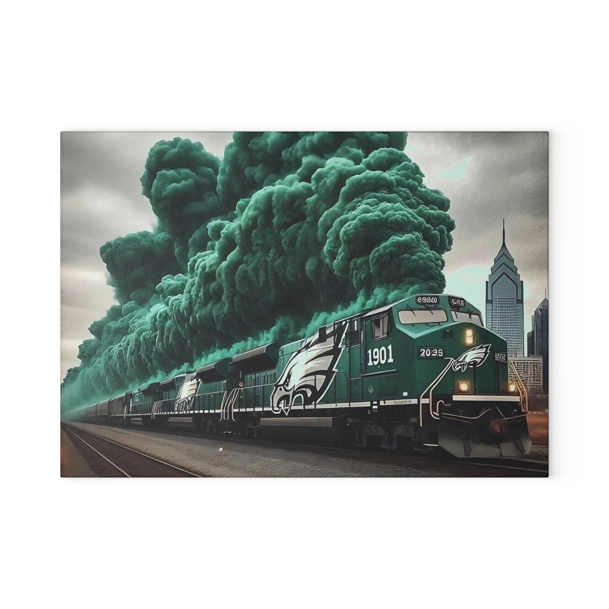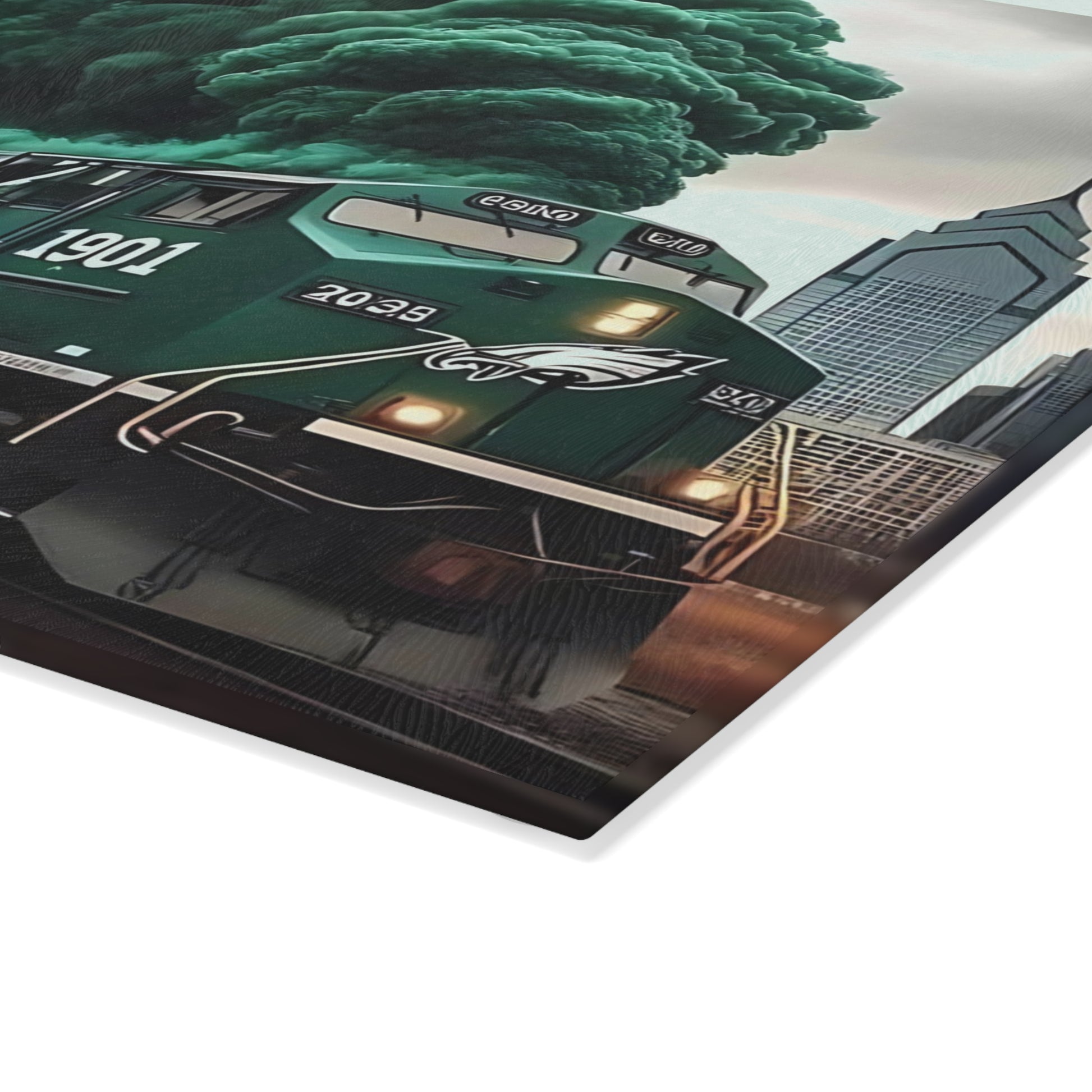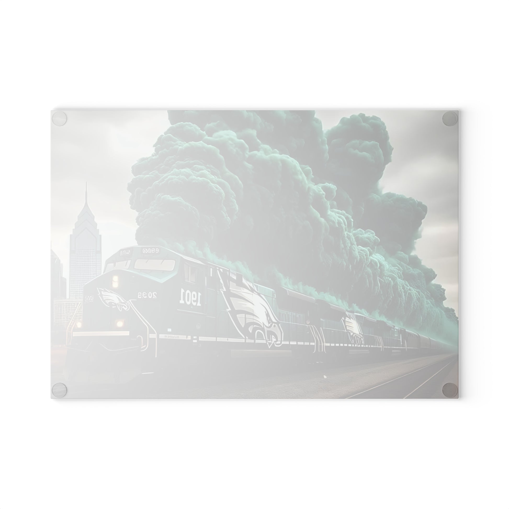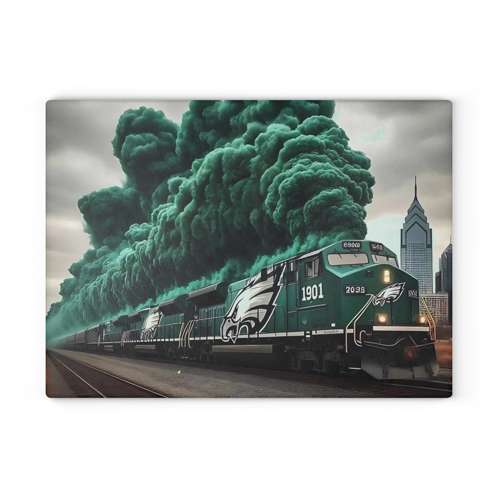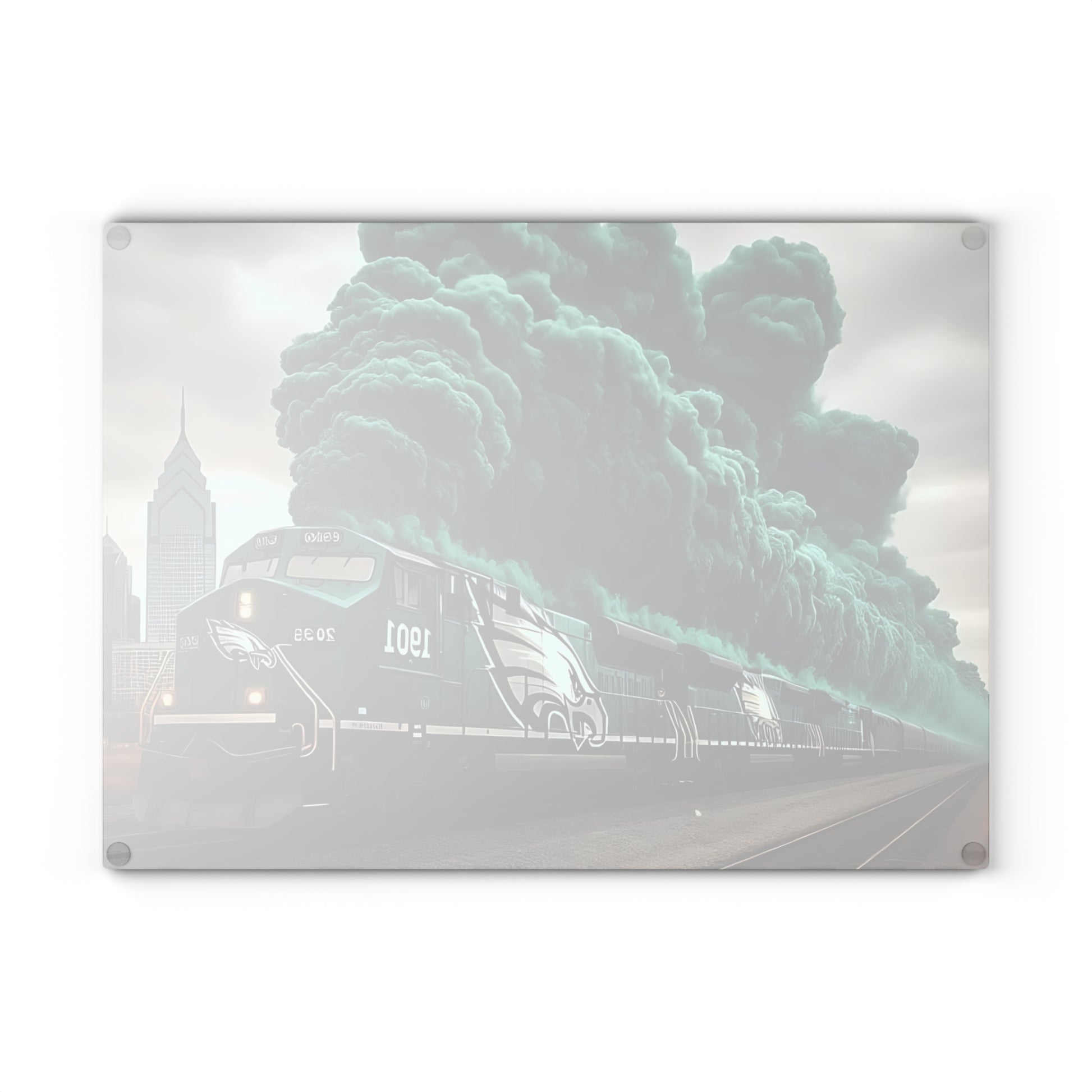 🚂 Dark Green & Silver Express Glass Cutting Board – Gritty Train Art for Bold & Timeless Kitchens