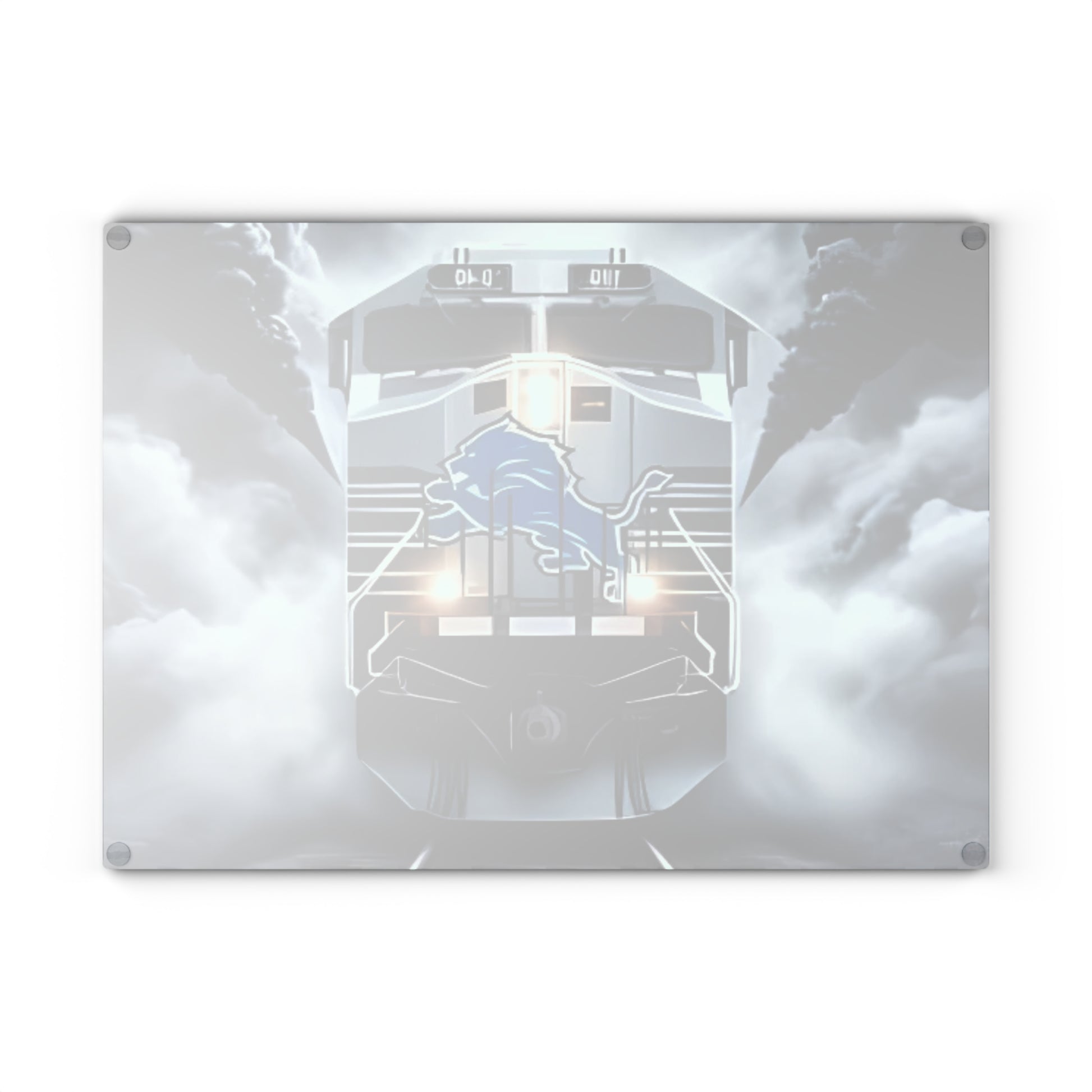 🚂 Light Blue & Silver Express Glass Cutting Board – Sleek Train Design for Cool, Modern Kitchens