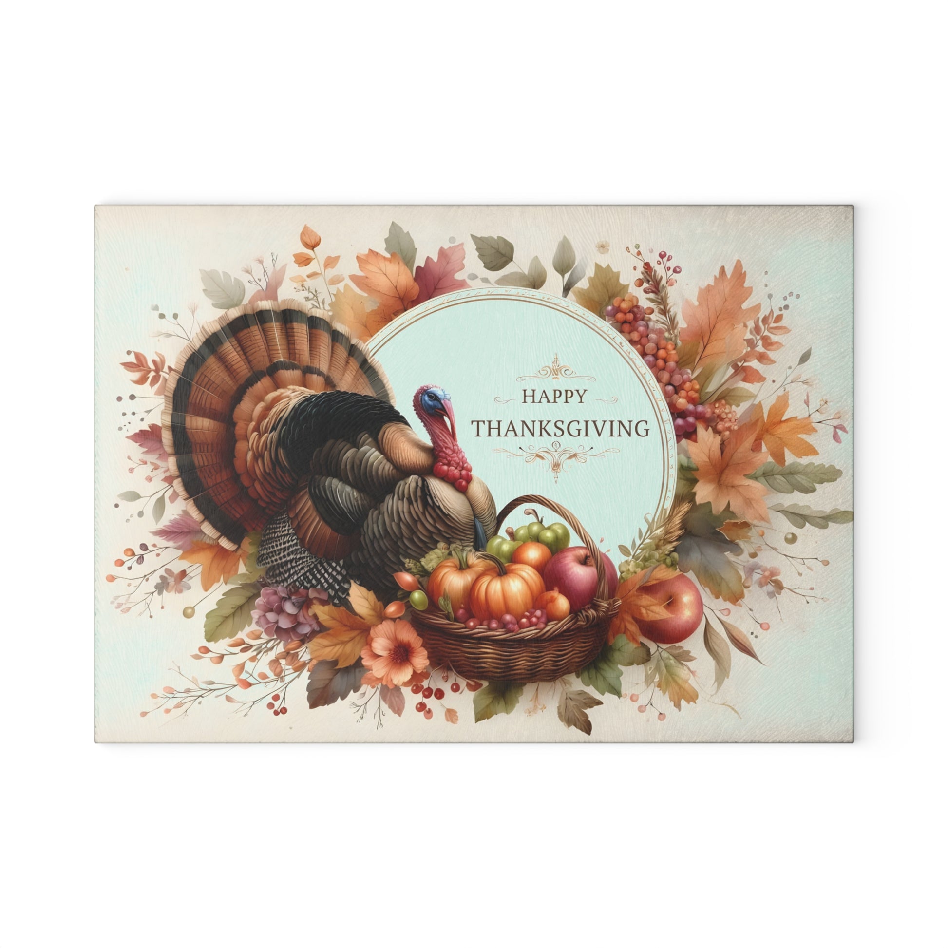 Celebrate the heart of the season with this breathtaking “Happy Thanksgiving” tempered glass cutting board! Featuring a beautifully detailed turkey surrounded by pumpkins, apples, grapes, and warm autumn leaves, this board captures the true essence of gratitude and harvest. Perfect for decorating your kitchen or dining area, serving during the holidays, or gifting to a Thanksgiving host, this piece adds charm and warmth to any fall home.