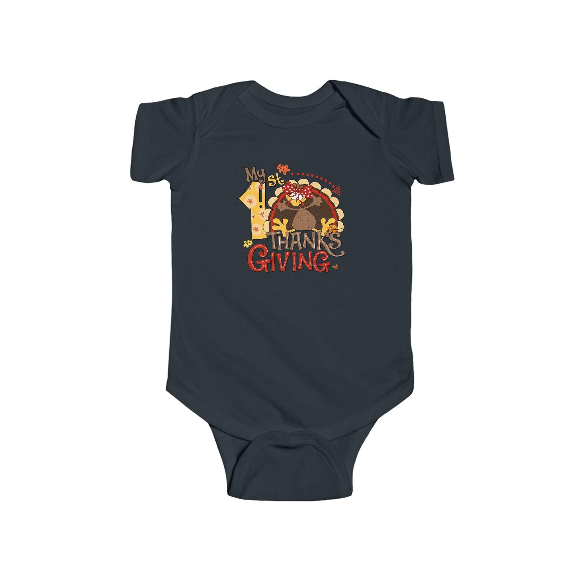 Celebrate your little girlโs very first Thanksgiving in style with this adorable turkey onesie! Featuring a playful cartoon turkey with a red bow and festive fall details, this outfit is perfect for capturing milestone photos, enjoying family dinners, and creating treasured holiday memories.