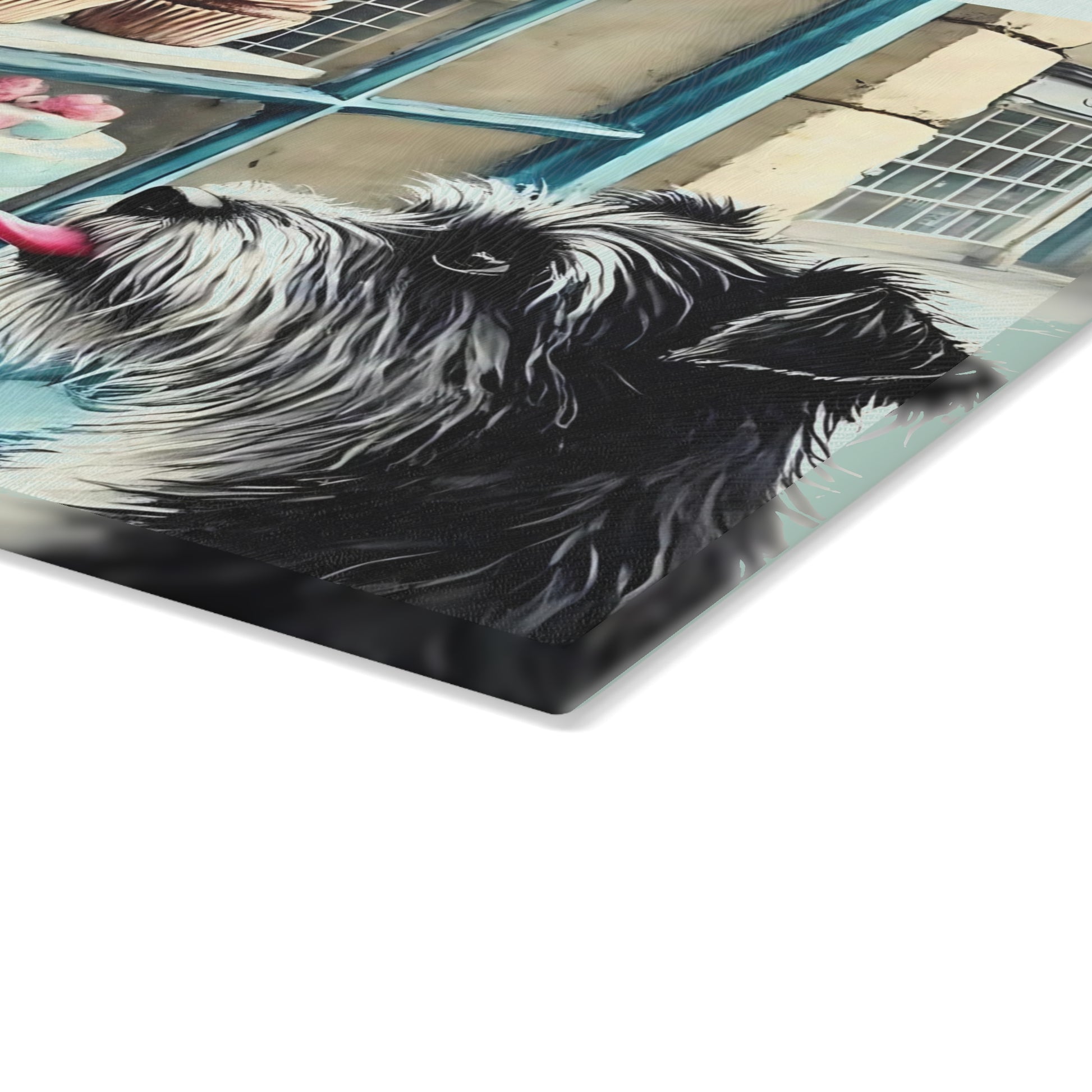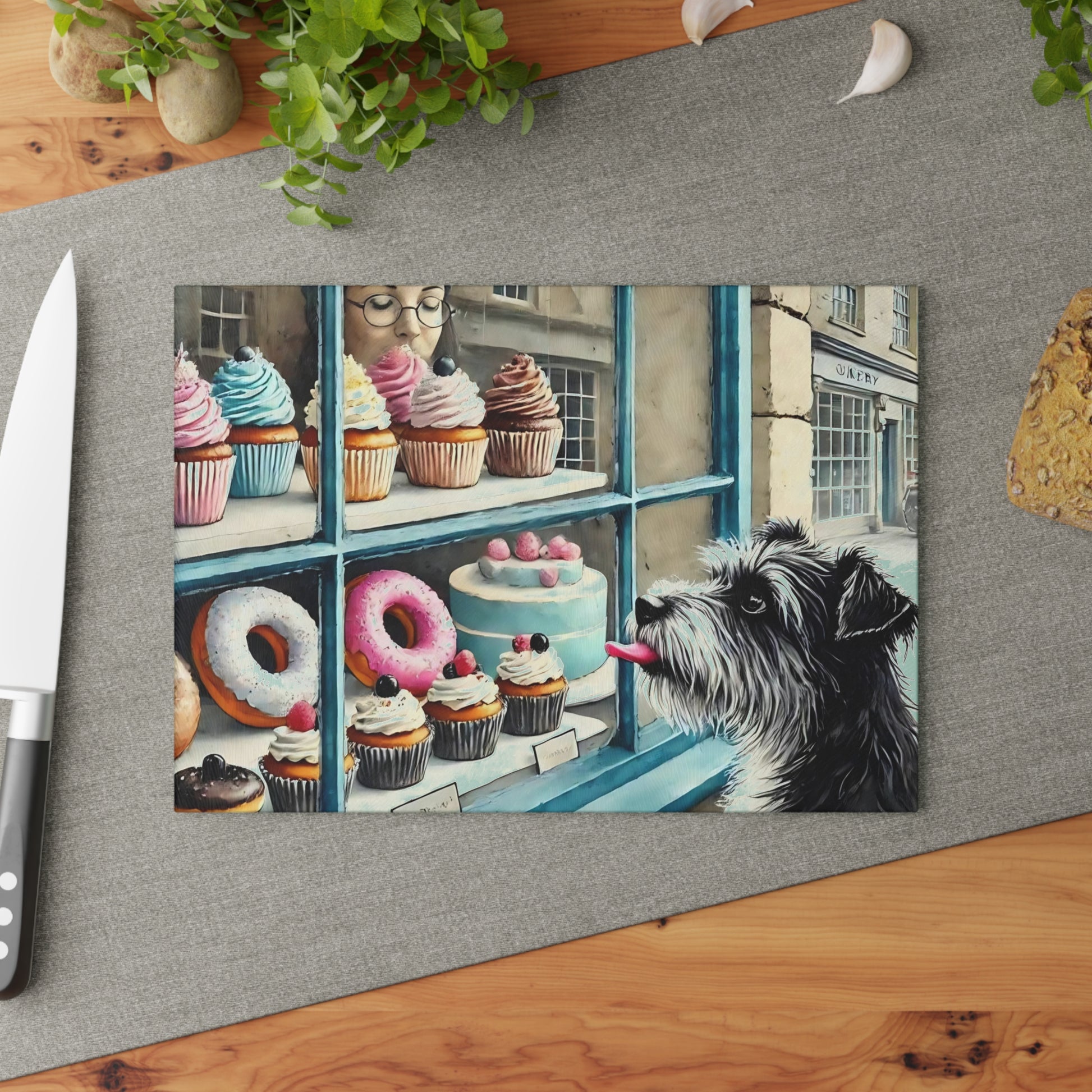 Add a touch of whimsy to your kitchen with this delightful Bakery Scene Cutting Board! Featuring a charming terrier dog licking his chops while gazing longingly at delicious bakery treats displayed in the window, and a cheerful baker smiling at the adorable pup, this design is full of warmth and personality. Perfect for baking enthusiasts, dog lovers, or anyone who enjoys fun and unique kitchen decor.