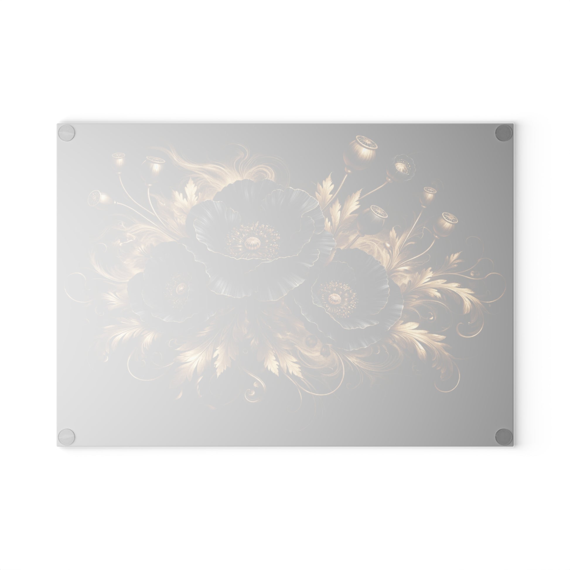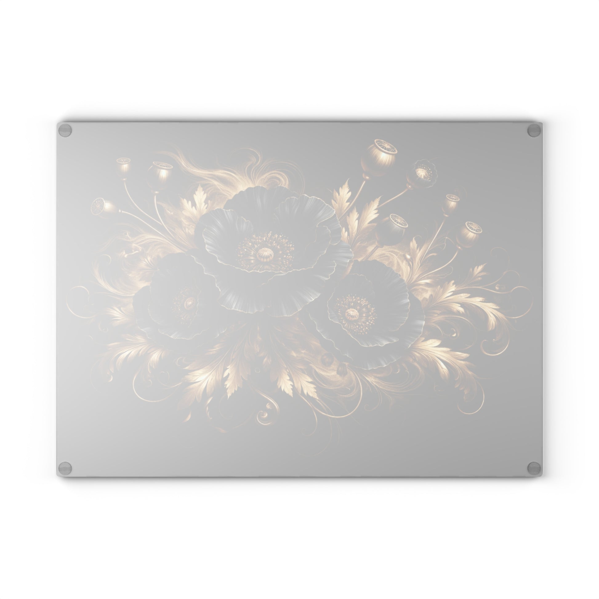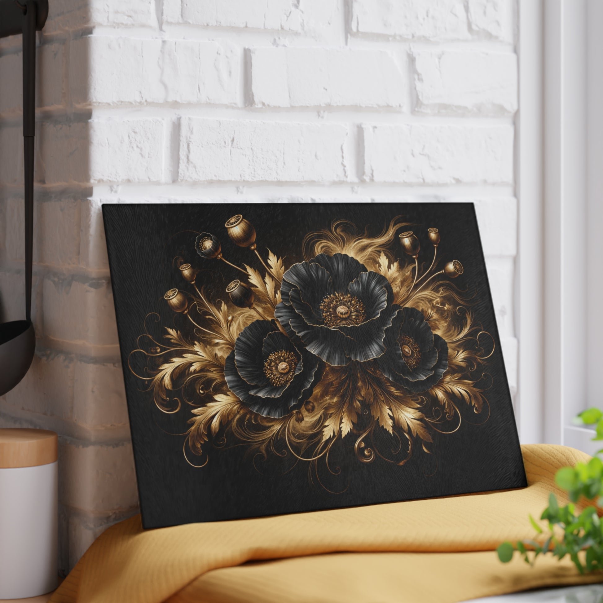 Add a touch of dramatic elegance to your kitchen with this black and gold floral glass cutting board, featuring richly detailed blossoms accented with flowing gold botanical elements on a deep black background. The striking contrast creates a luxurious, sophisticated look that instantly elevates countertops, coffee bars, and open shelving.