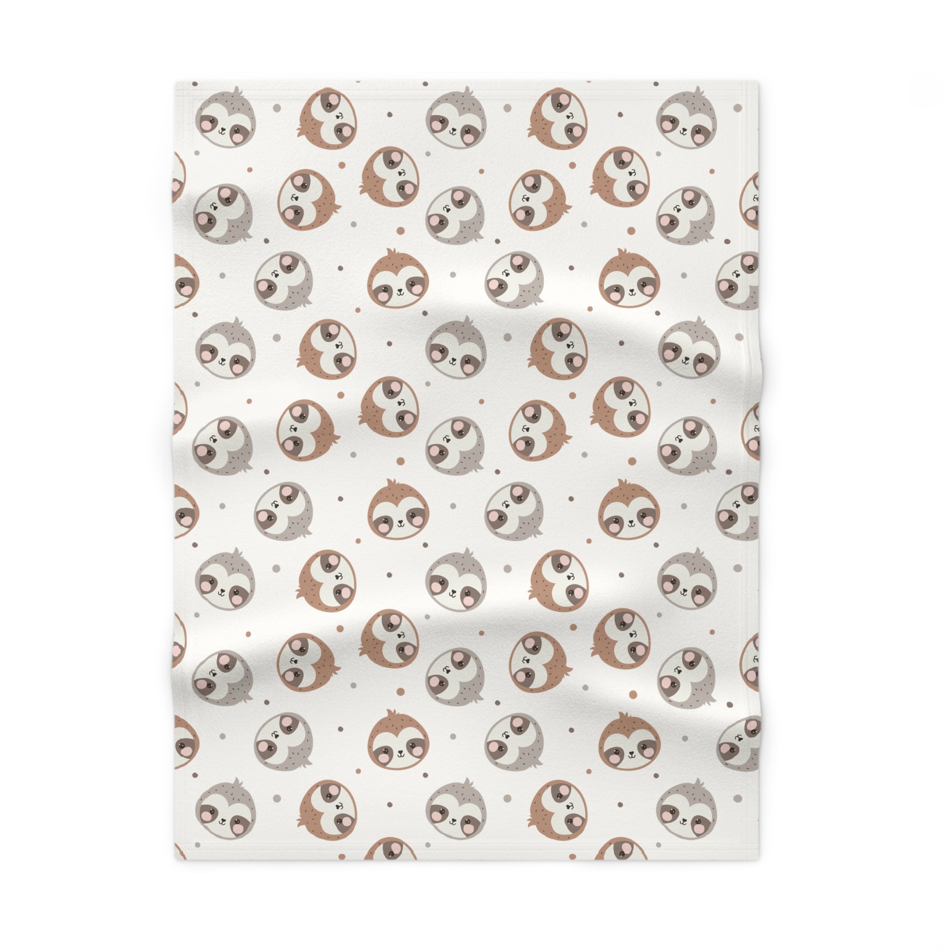 Snuggle them in slow-and-sweet comfort. This ultra-soft fleece baby blanket features adorable sloth faces and tiny dots on a warm cream background—lightweight, cozy, and gentle on delicate skin. A modern neutral that works in any nursery, it’s perfect for stroller rides, tummy-time snuggles, naps, and bedtime stories, and it makes a darling gift for showers, first birthdays, and the holidays.