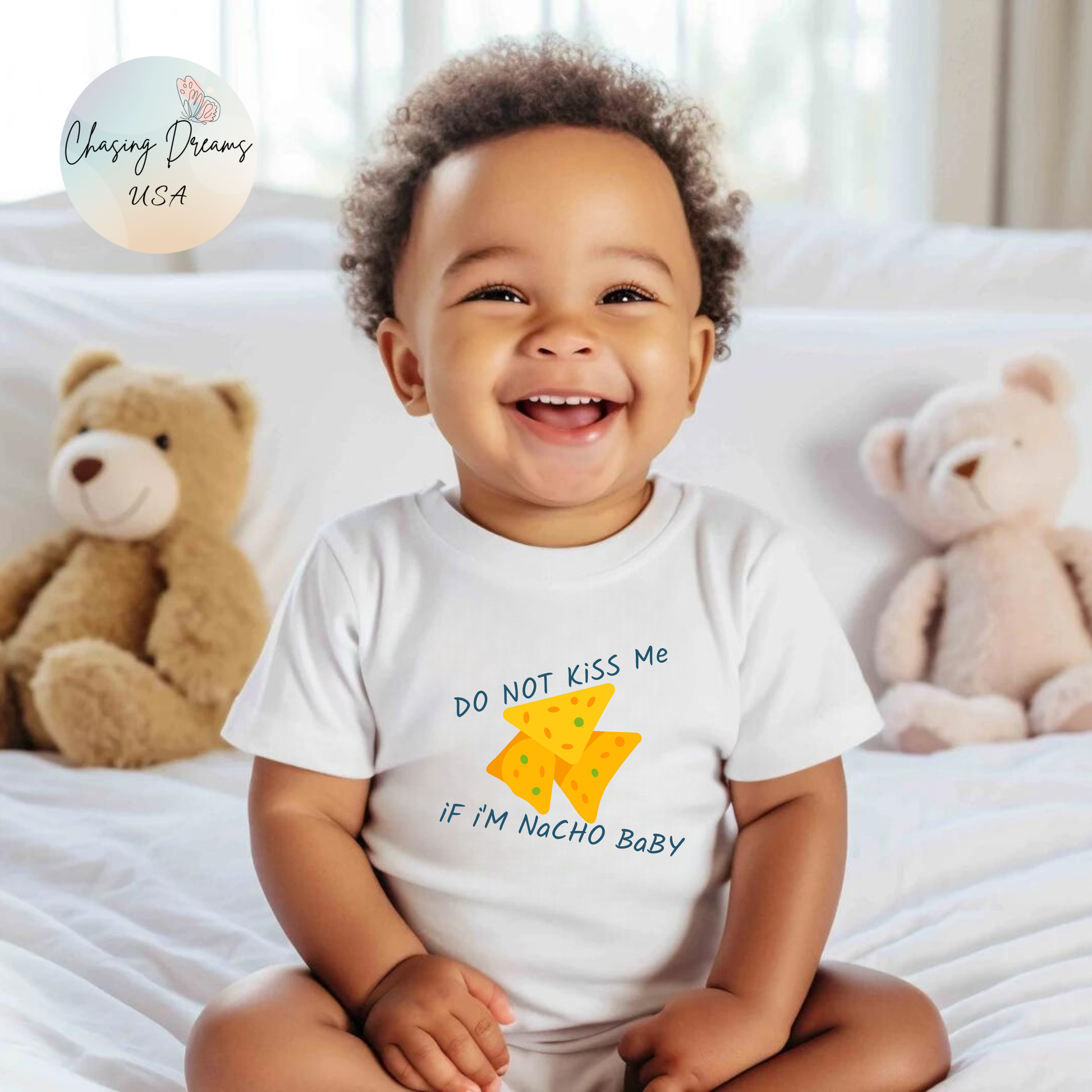 This adorable “Do Not Kiss Me If I’m Nacho Baby” onesie brings humor and personality to your little one’s everyday look. Made from soft, breathable cotton, it’s perfect for cozy naps, playtime, or making everyone smile with a cheeky pun.