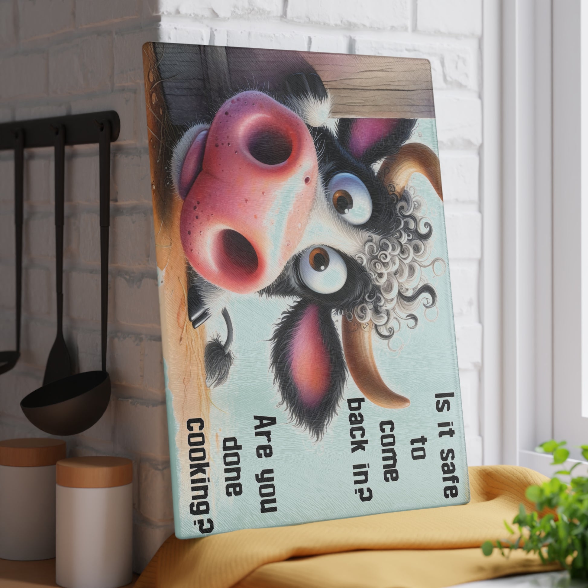 Add humor and farmhouse charm to your kitchen with this playful cow-themed glass cutting board. Featuring a wide-eyed, curious cow peeking around a wooden post with the humorous phrase “Is it safe to come back in? Are you done cooking?”, this design brings personality, warmth, and a touch of country fun into any kitchen space. The expressive artwork and clean background allow the character and message to shine, making it a lighthearted yet stylish accent.