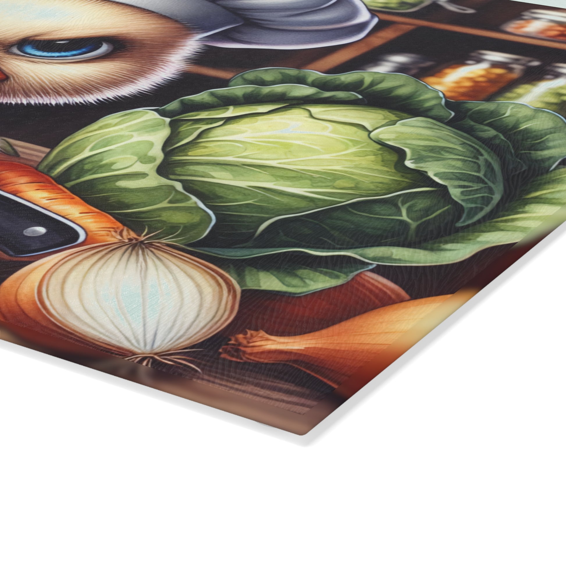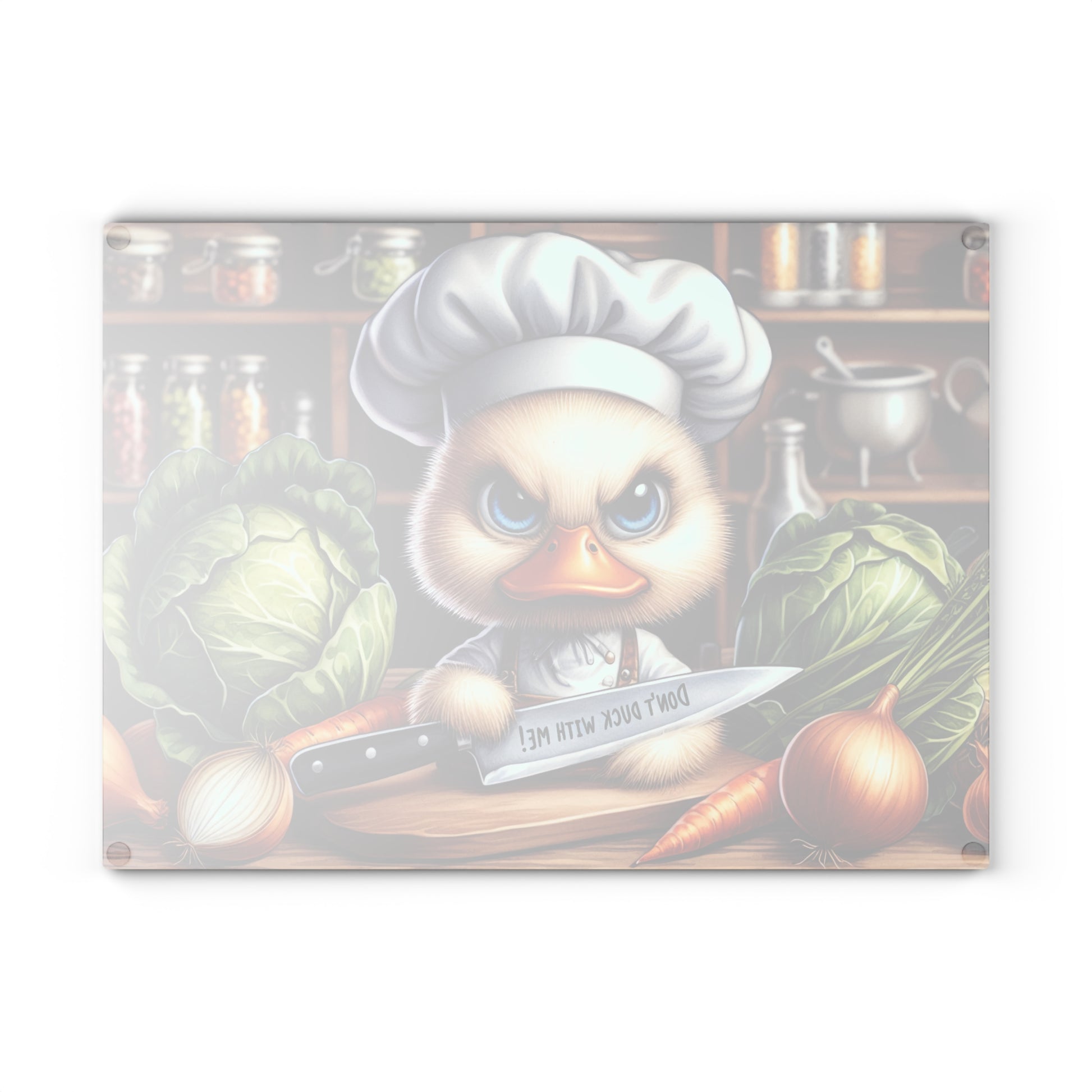 Add bold personality and playful charm to your kitchen with this “Don’t Duck With Me” glass cutting board. Featuring an expressive duck dressed as a chef, holding a knife and surrounded by fresh vegetables in a cozy kitchen setting, this design blends humor with artistic detail. The rich colors, expressive eyes, and whimsical character make this piece an instant conversation starter while keeping a warm, farmhouse-inspired feel.