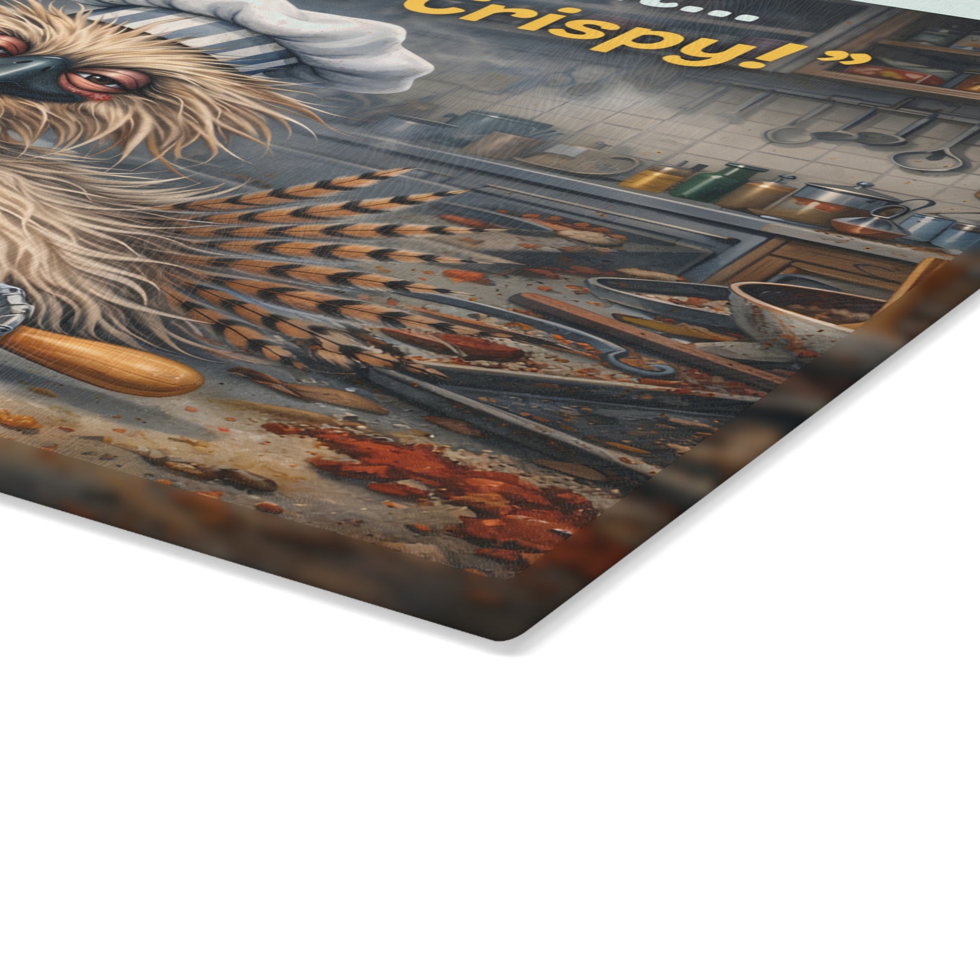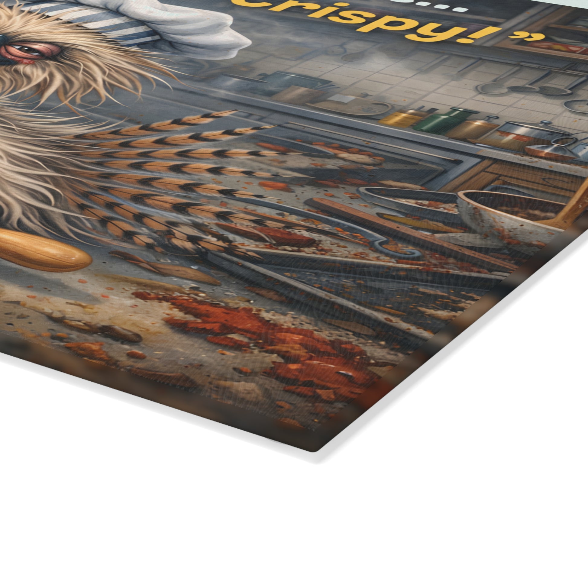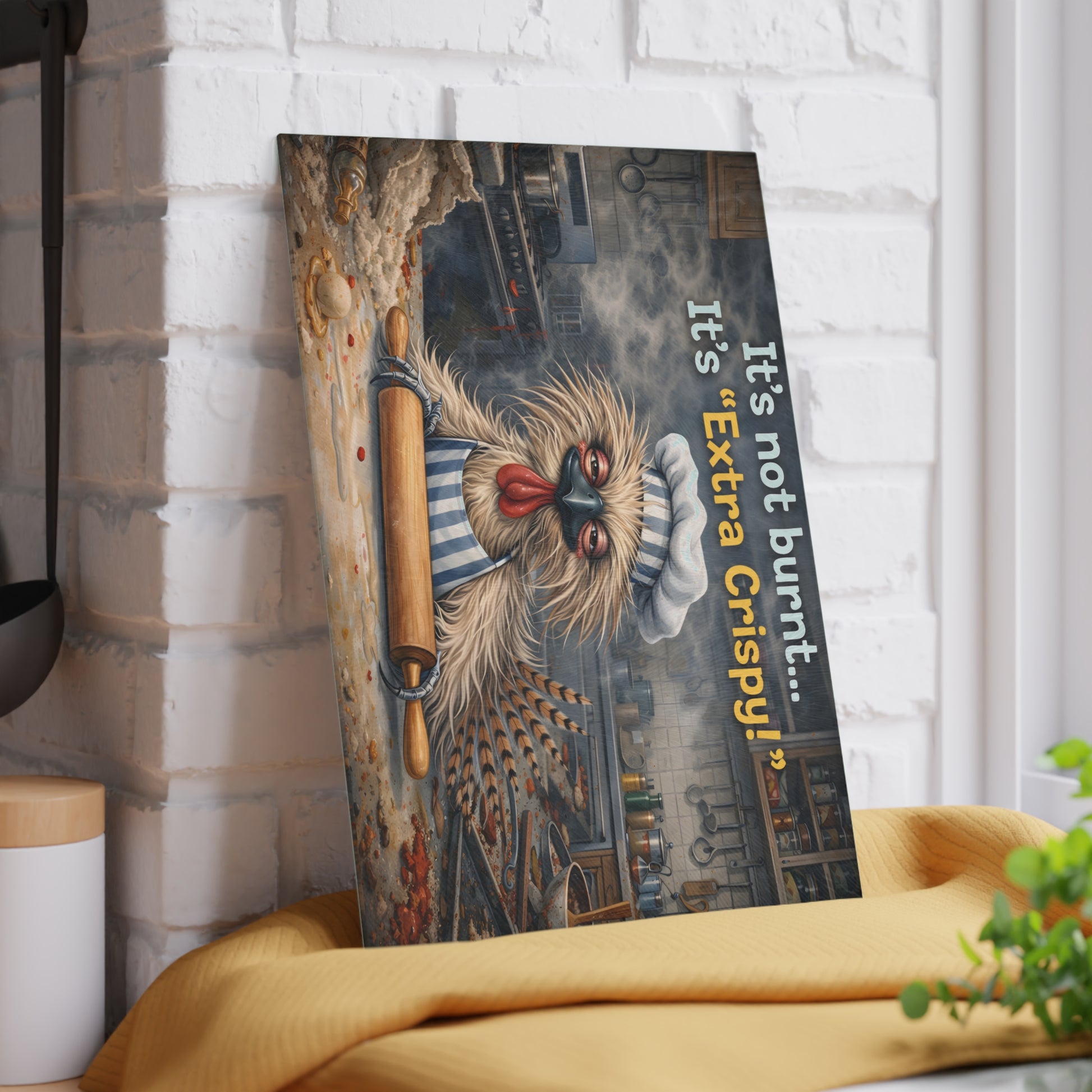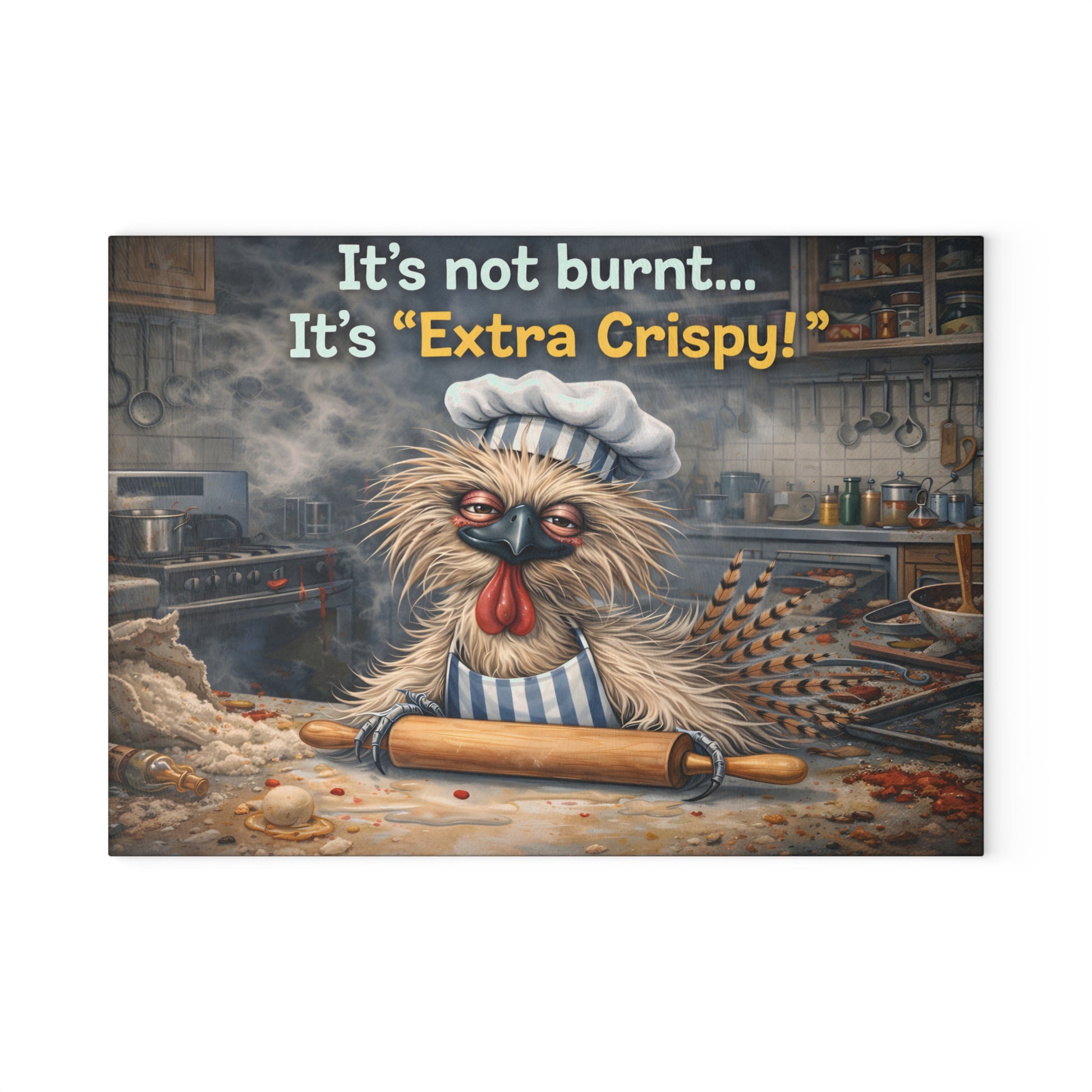 Extra Crispy Kitchen Humor Glass Cutting Board – Playful Baking Chicken Art Decor