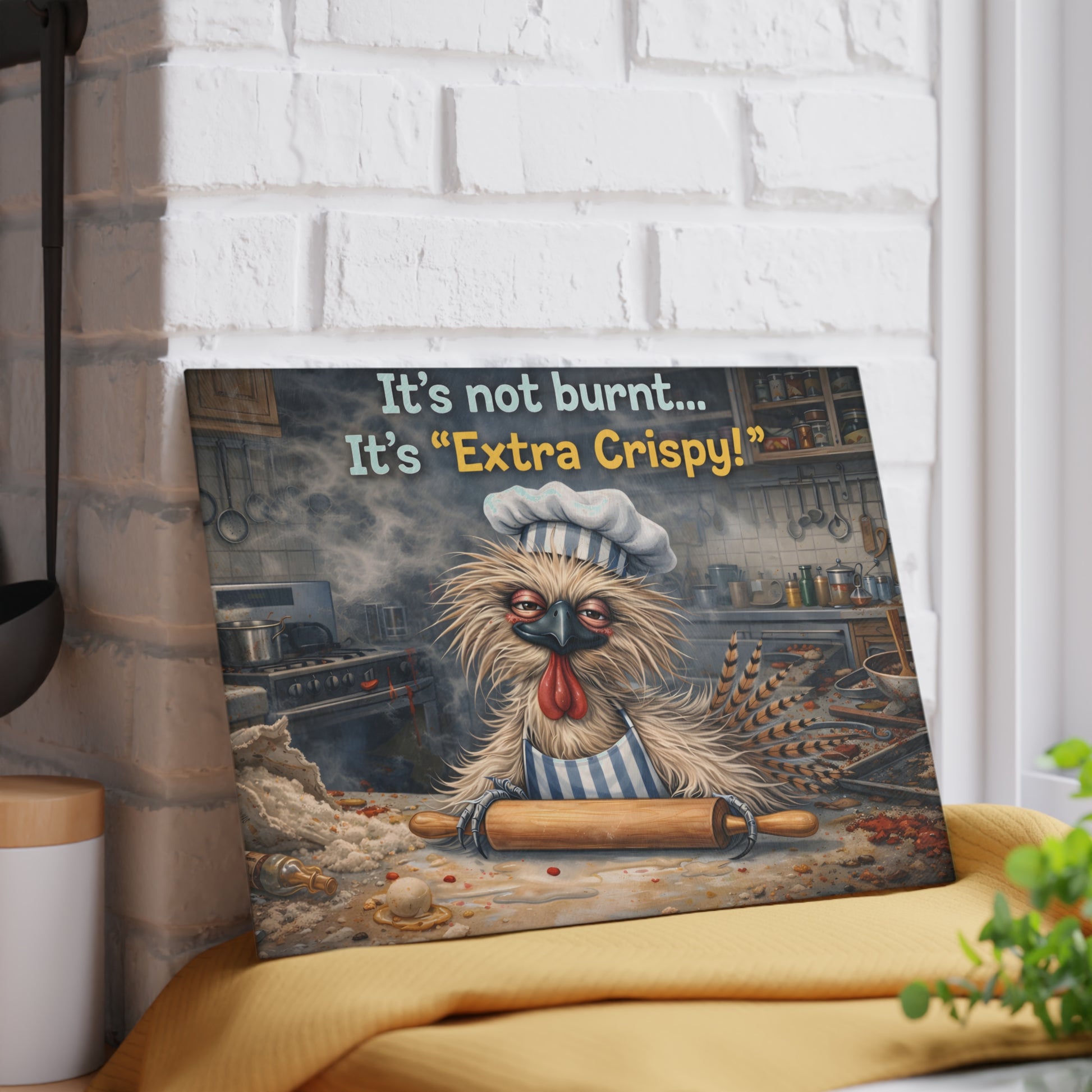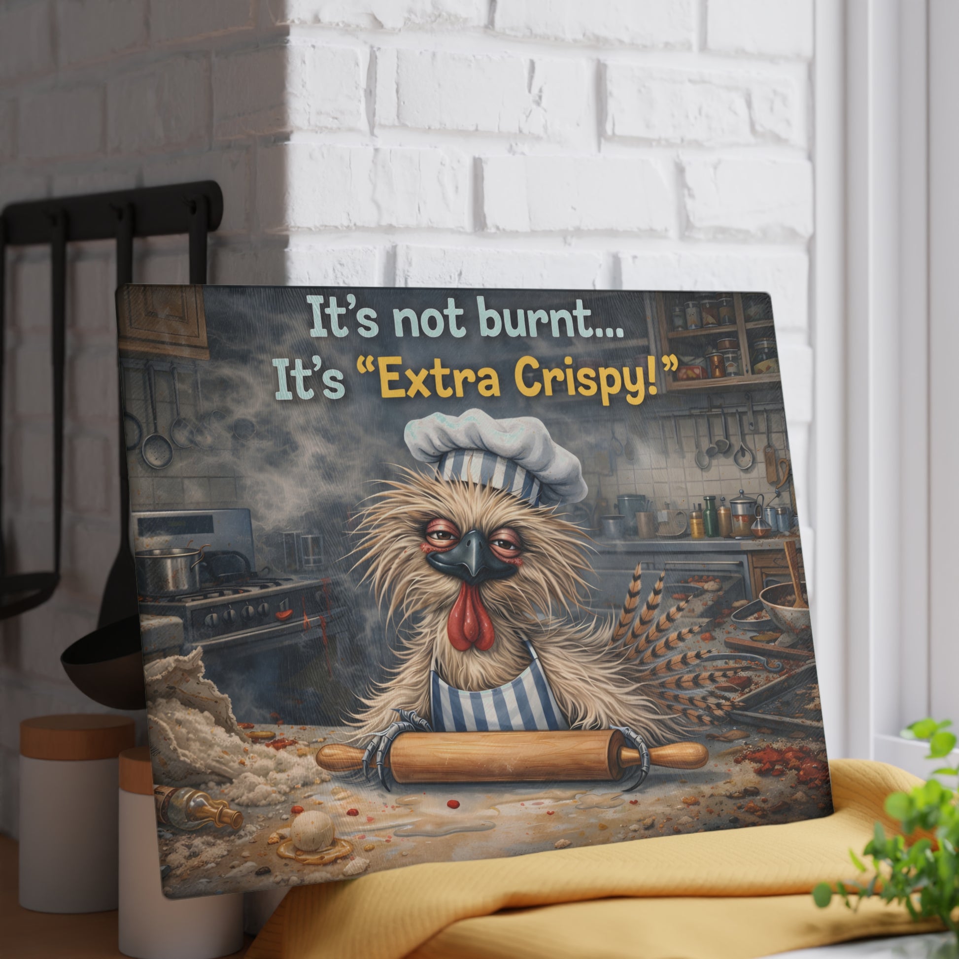 Add humor and personality to your kitchen with this playful glass cutting board featuring a quirky, extra-crispy chicken character hard at work in the kitchen. With flour on the counter, a rolling pin in wing, and a knowing expression, this design delivers lighthearted charm and baking-inspired humor that instantly sparks smiles. The warm kitchen setting and floating heart accents add a cozy, fun-loving vibe that makes this piece stand out.