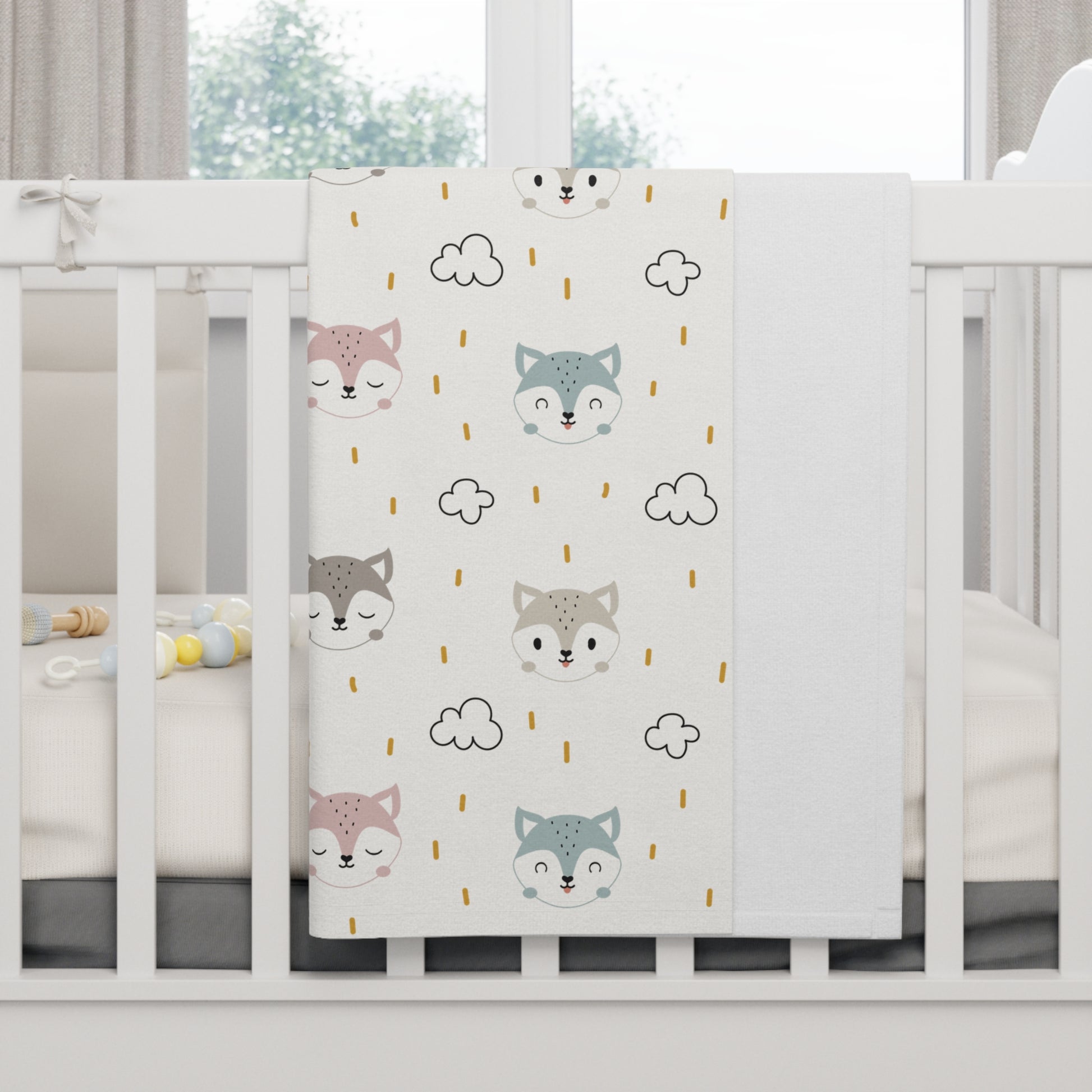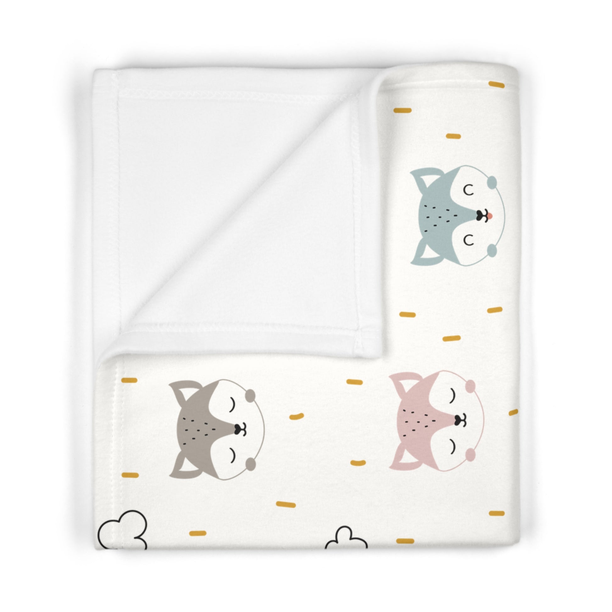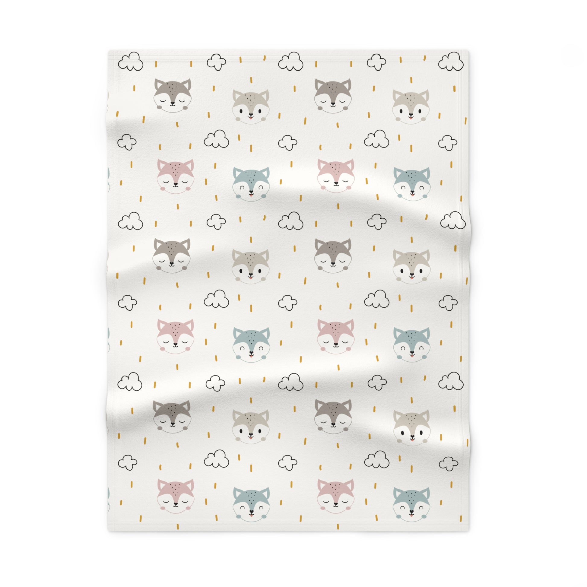 🦊 Fox Faces & Clouds Baby Blanket – Ultra-Soft Fleece 30″×40″ | Neutral Pastel on White