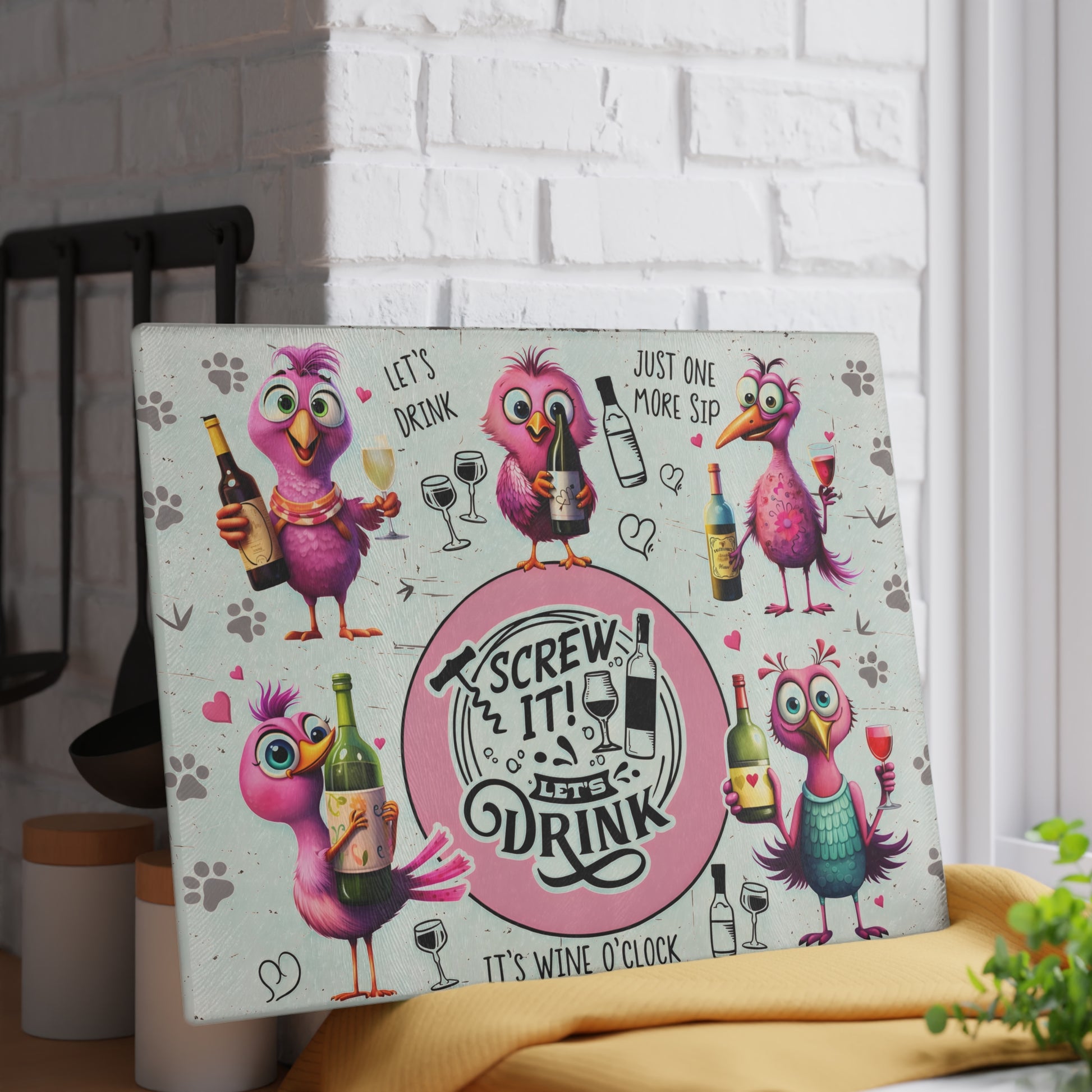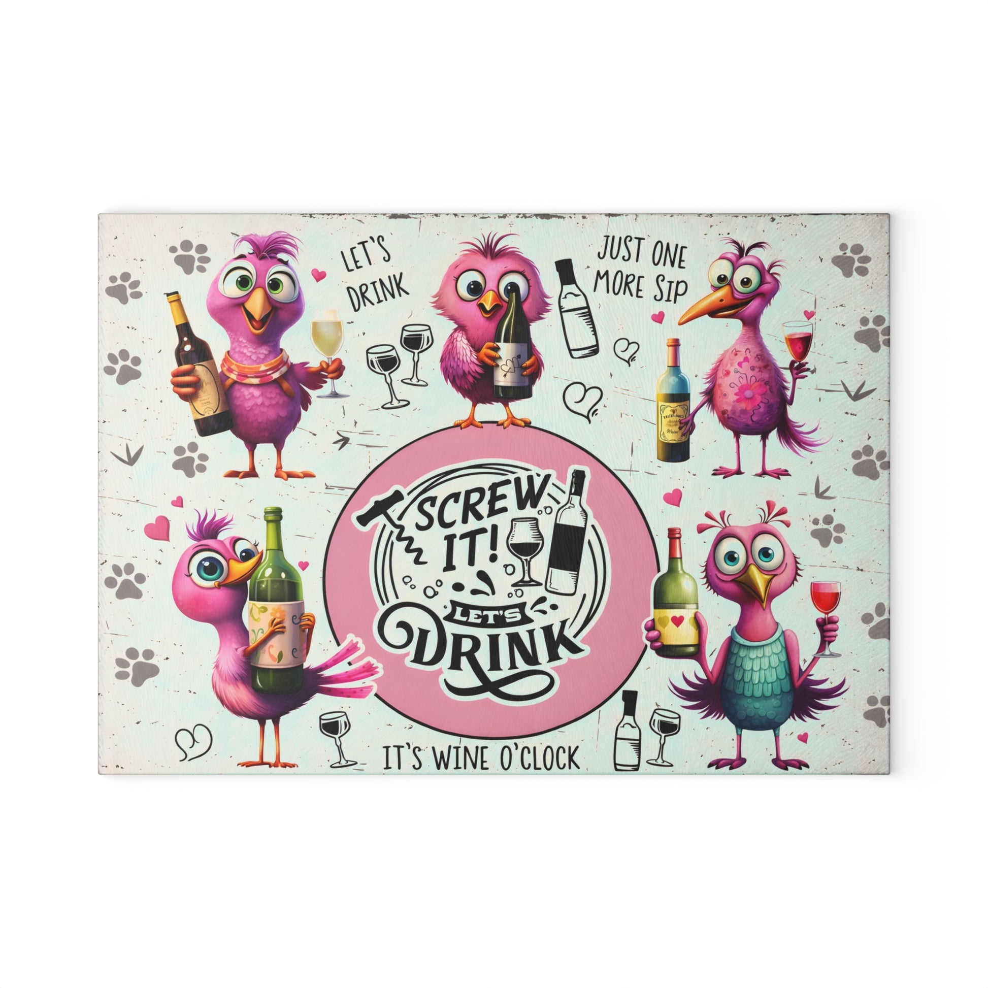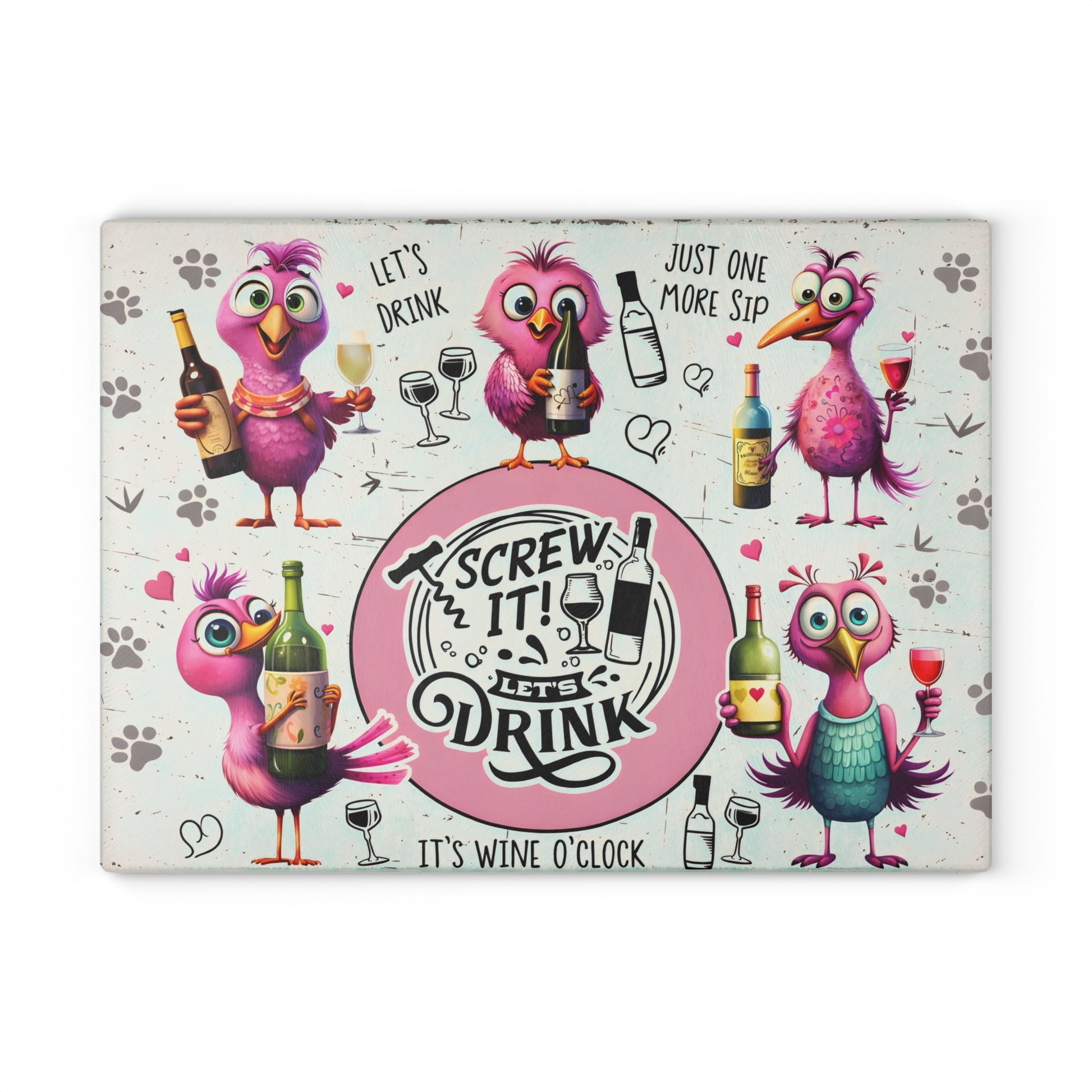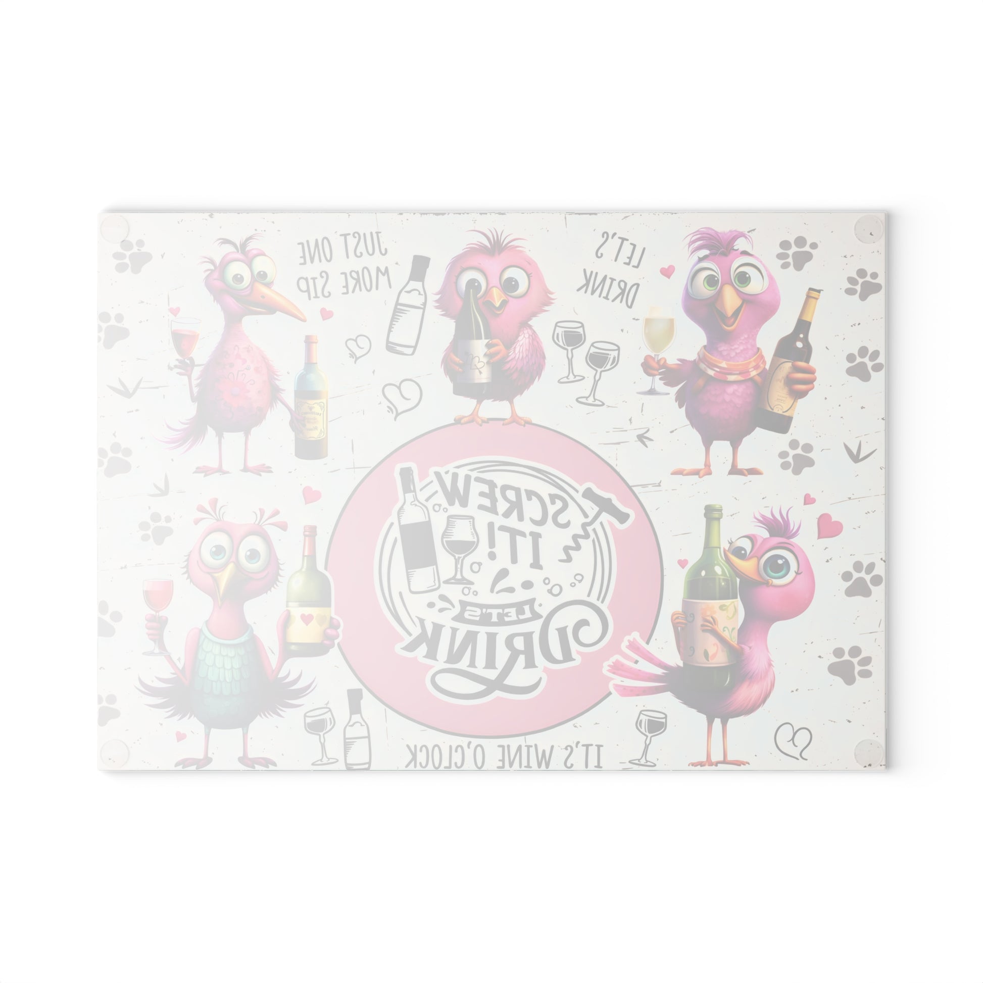 Add personality and playful humor to your kitchen with this colorful bird-themed glass cutting board featuring cheerful illustrated birds and lighthearted wine-inspired phrases. Designed with bright pink characters, expressive faces, and a fun circular centerpiece, this artwork brings laughter and charm to any space. The whimsical style makes it a standout piece for entertaining areas, kitchen counters, or home bars.
