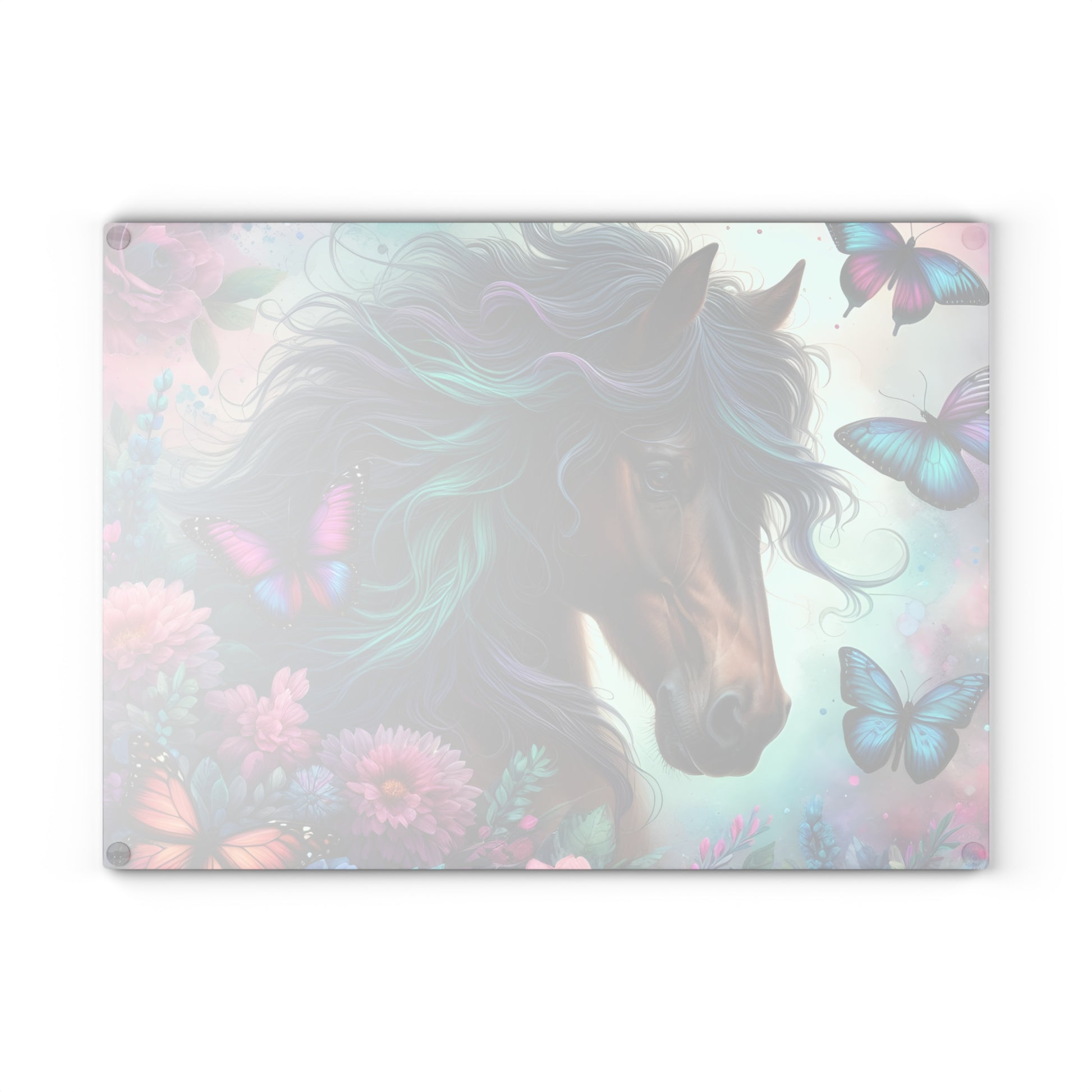 Step into a world of enchanting beauty with our Majestic Horse & Butterfly Dreamscape Tempered Glass Cutting Board. Featuring a stunning brown horse framed by flowing teal and violet mane details, surrounded by fluttering butterflies and vibrant garden blooms, this cutting board is a breathtaking mix of art and function. Whether you’re prepping meals, serving guests, or simply elevating your kitchen décor, this piece brings bold elegance and a magical touch to any space.