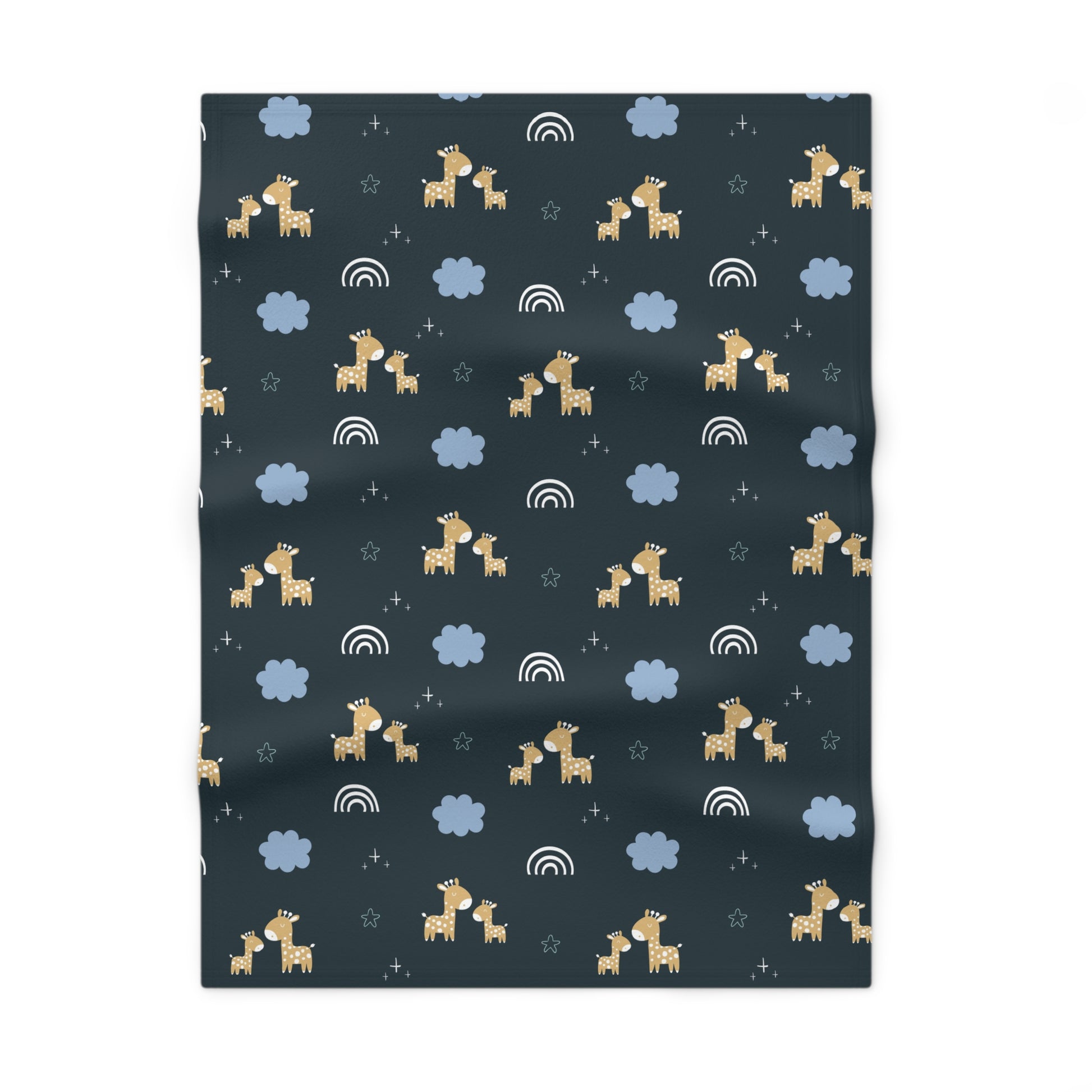 Snuggle time meets safari sweet. This ultra-soft fleece baby blanket features darling parent-and-calf giraffes, puffy blue clouds, twinkly stars, and rainbow arcs on a deep navy sky. Lightweight yet warm and gentle on delicate skin, it’s perfect for stroller rides, tummy time, naps, and bedtime stories—and a thoughtful gift for showers, first birthdays, and the holidays.
