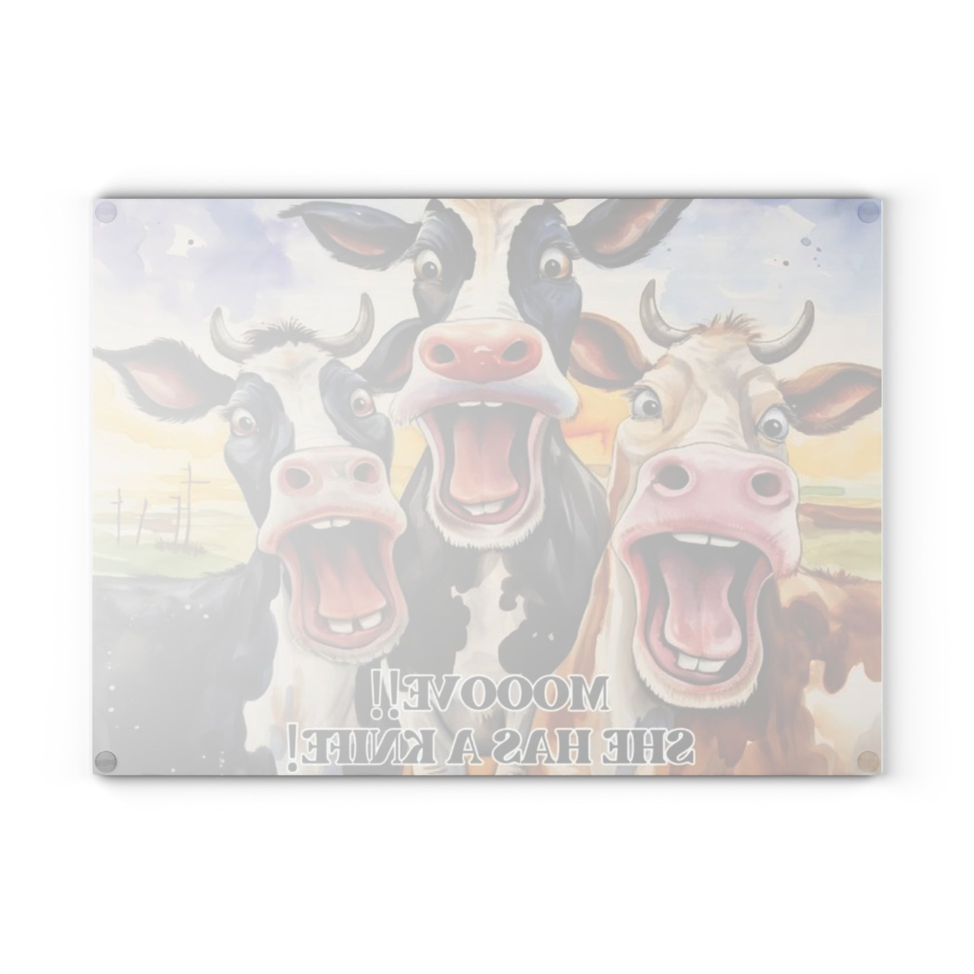 MOOOVE!! SHE HAS A KNIFE! – Funny Cow Tempered Glass Cutting Board