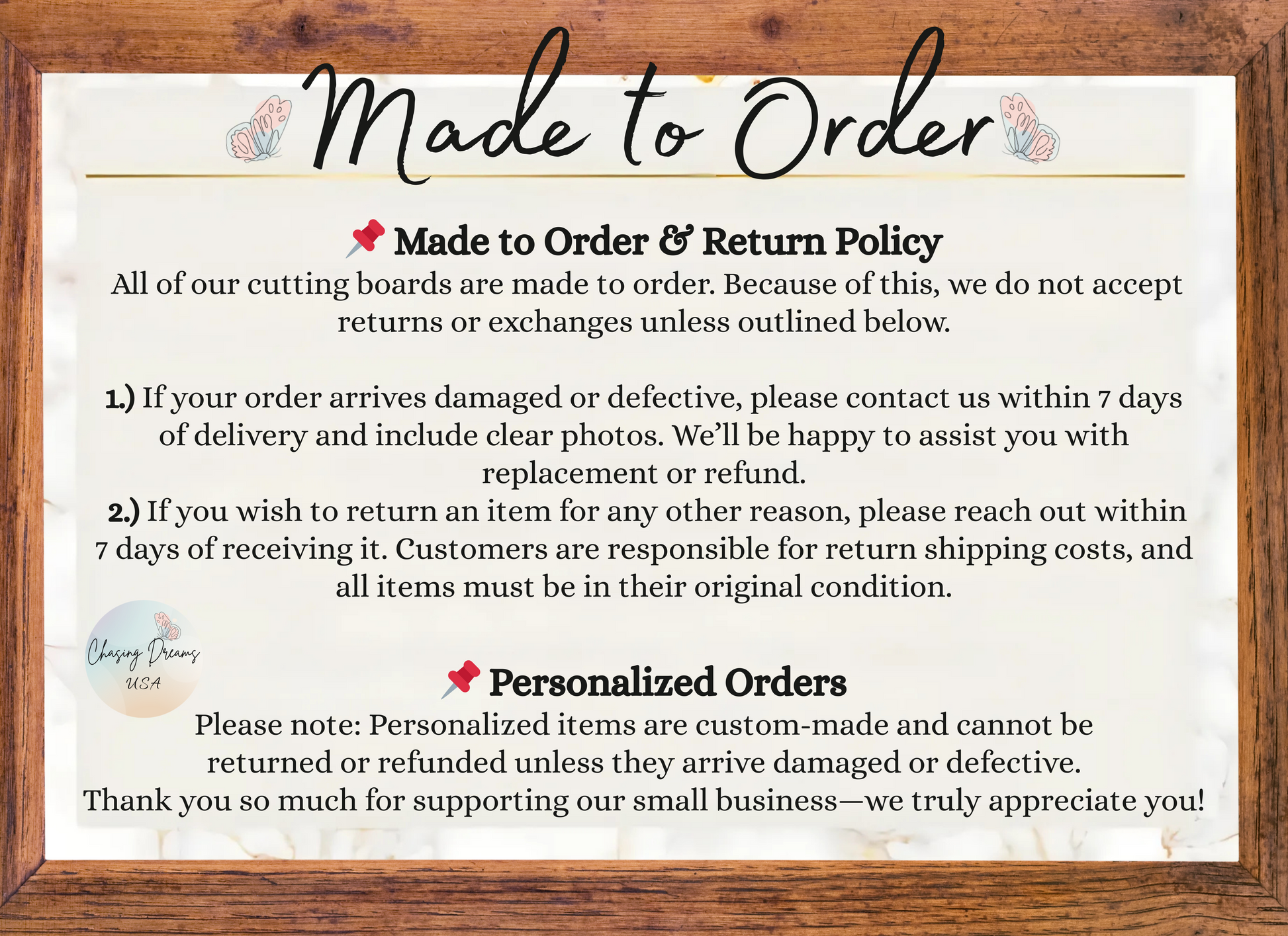 Custom orders are made just for you and are not returnable unless damaged or defective.