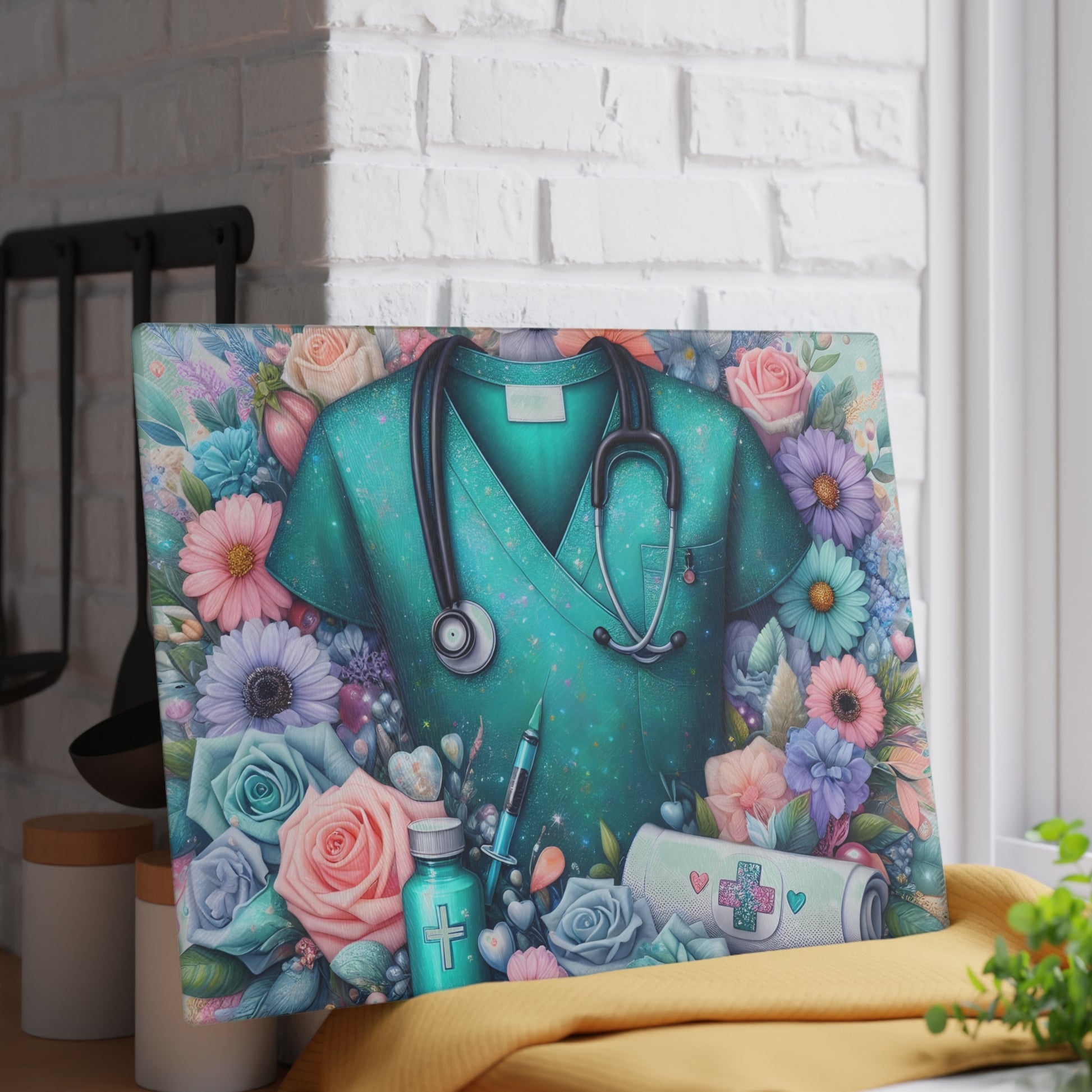 Honor the dedication and compassion of healthcare professionals with this Nurse Scrubs and Florals Cutting Board. Featuring a teal scrub top surrounded by soft pastel florals and subtle medical elements such as a stethoscope and medicine accents, this design blends professional pride with gentle elegance. Whether used as a functional kitchen surface or displayed as meaningful décor, this board adds warmth and appreciation to any home.