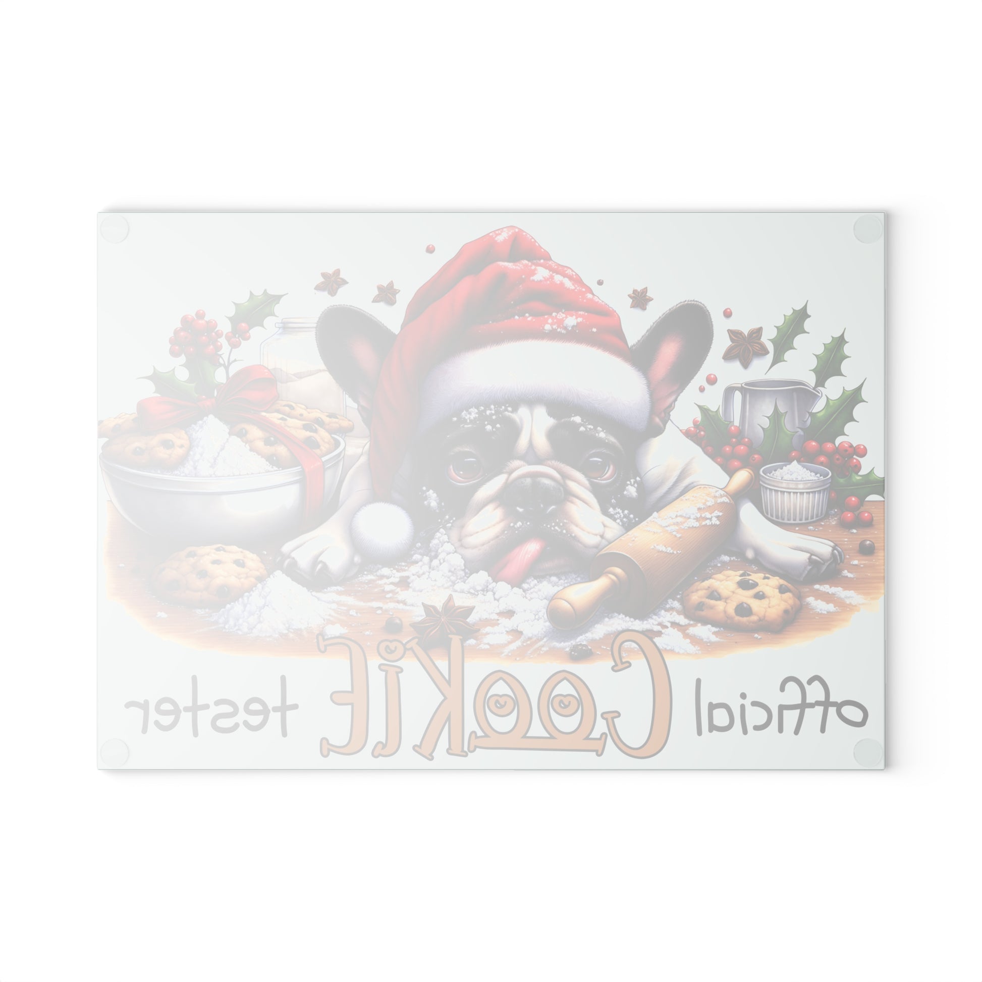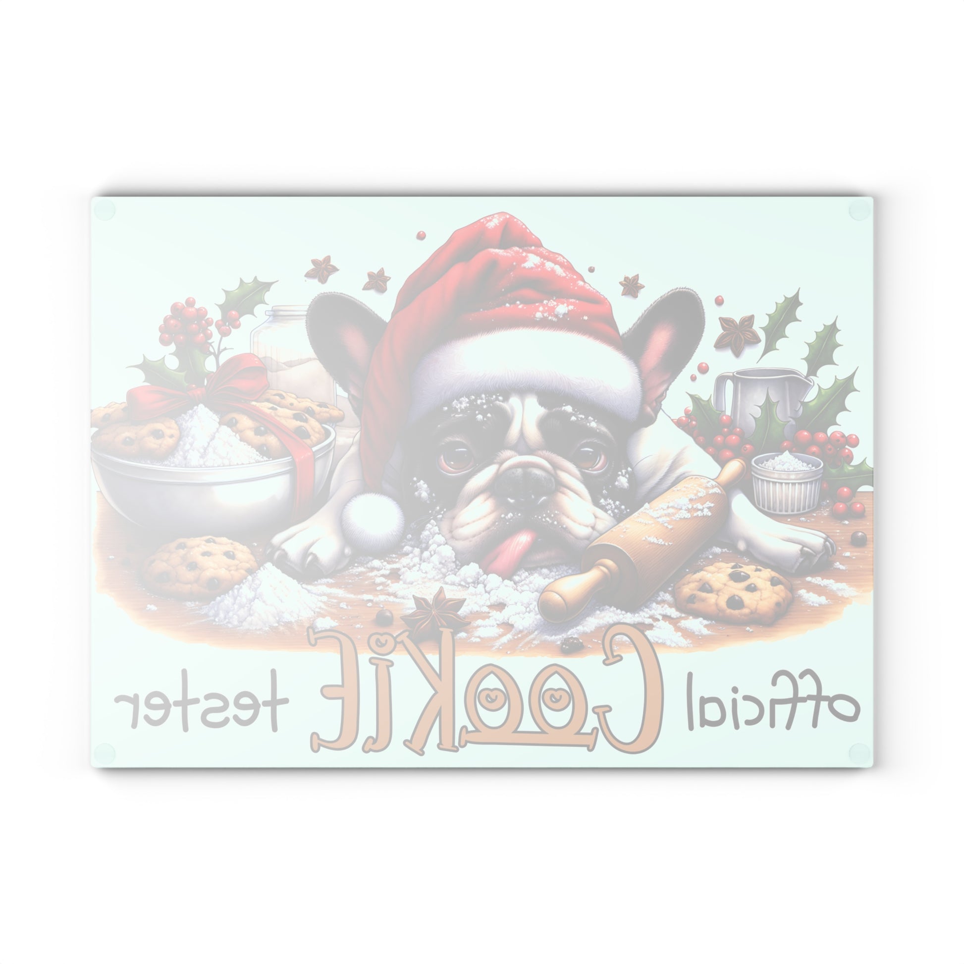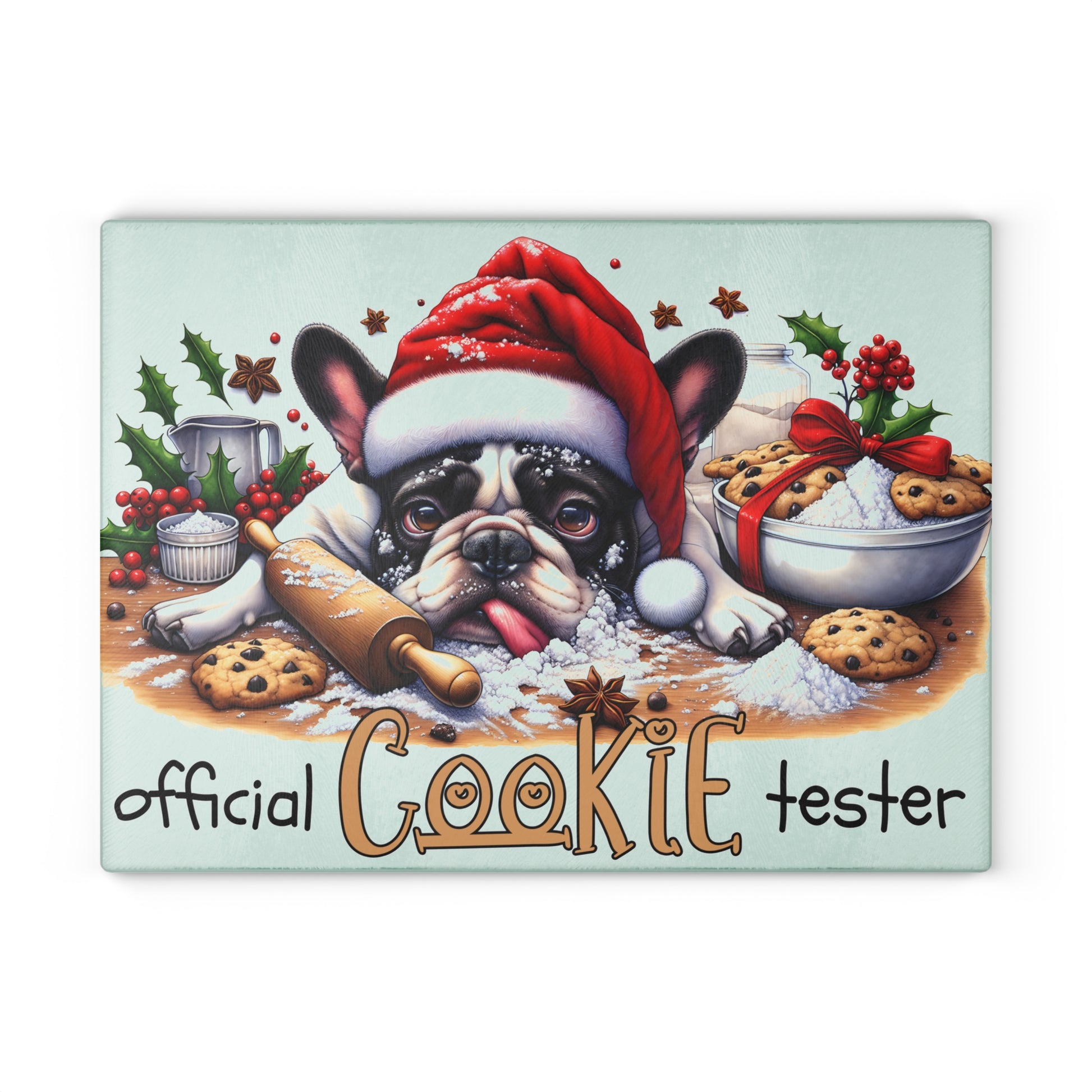 Bring playful holiday cheer to your countertop with this adorable “Official Cookie Tester” Boston design! Featuring a festive pup in a Santa hat surrounded by cookies, sprinkles, rolling pins, and bright Christmas accents, this whimsical cutting board instantly warms up any kitchen. Whether you display it as seasonal décor or use it while baking your favorite treats, it’s an eye-catching addition that spreads joy all season long.