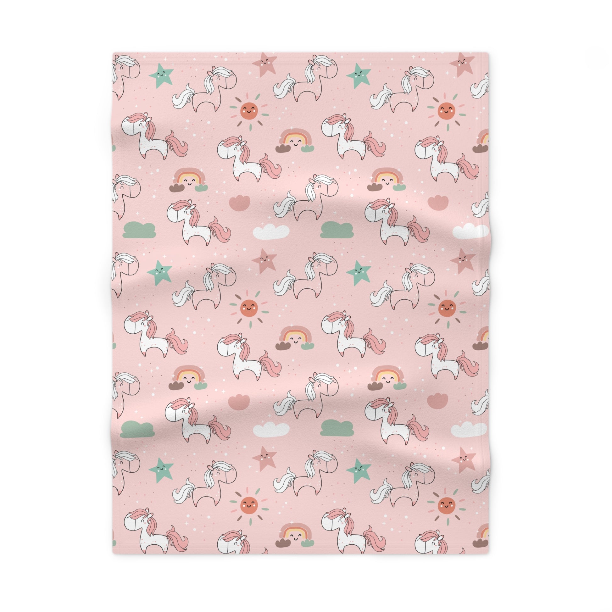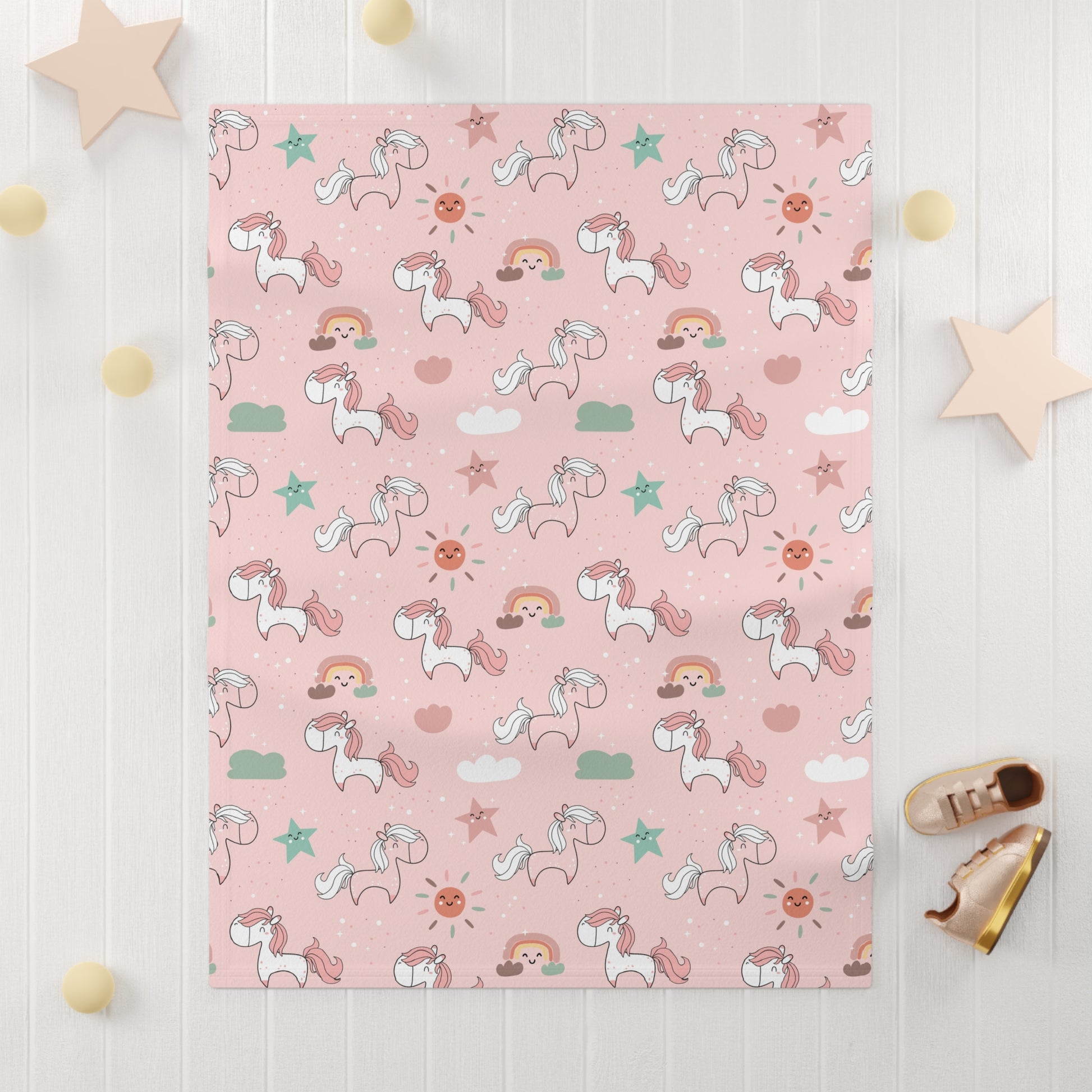 Wrap your little dreamer in cozy magic. This ultra-soft fleece baby blanket features adorable ponies, smiling rainbows, twinkly stars, and sunny accents on a blush-pink sky. Lightweight yet warm and gentle on delicate skin, it’s perfect for stroller rides, tummy time, naps, and bedtime stories—and it makes a darling gift for showers, first birthdays, and the holidays.