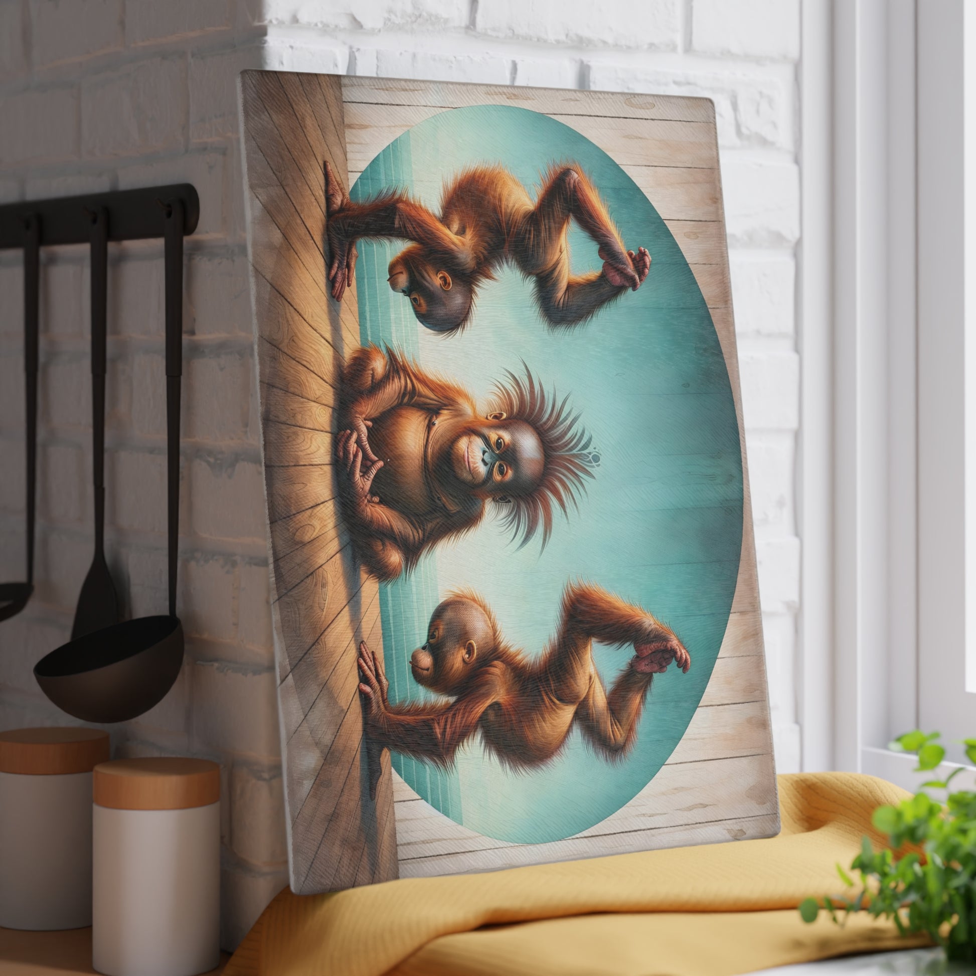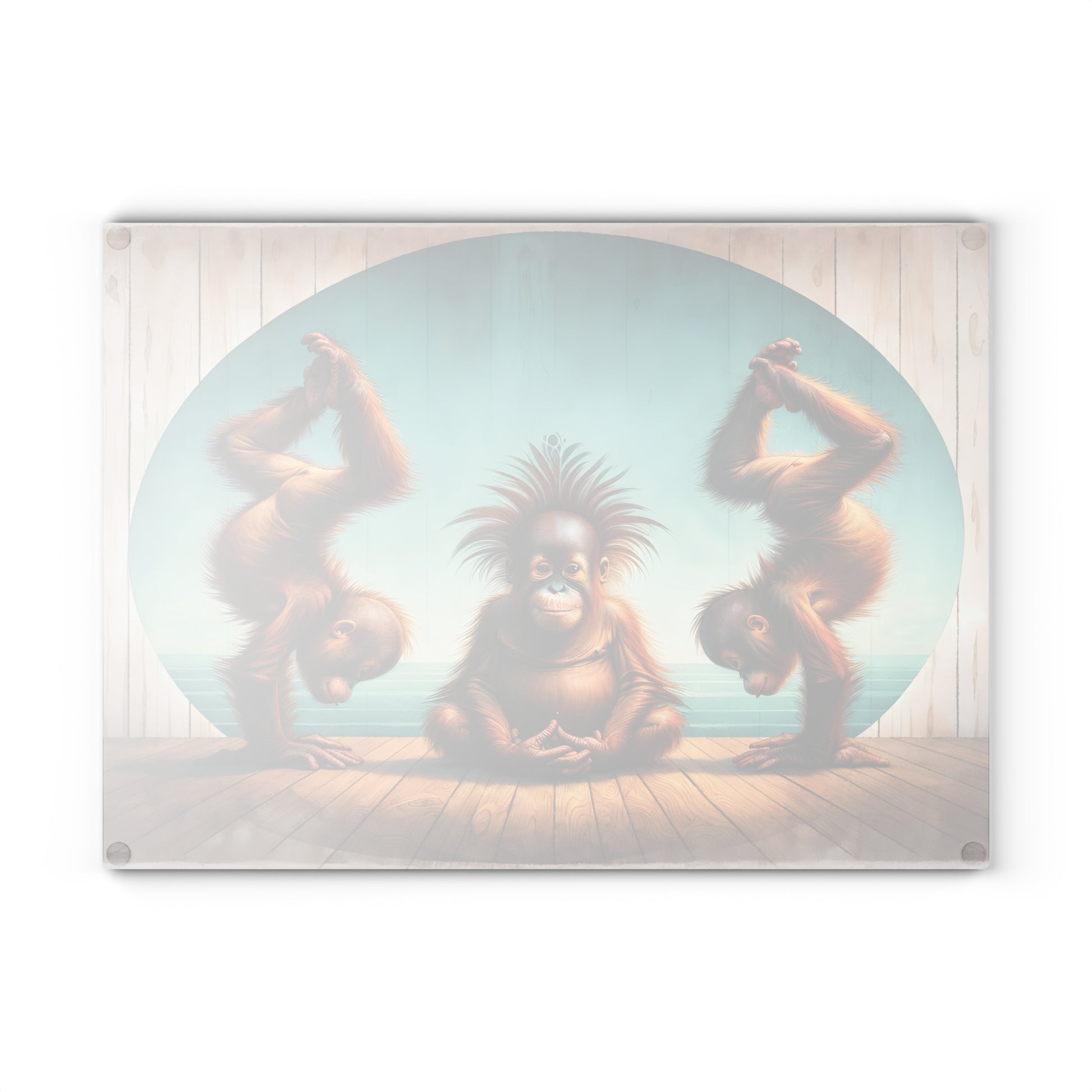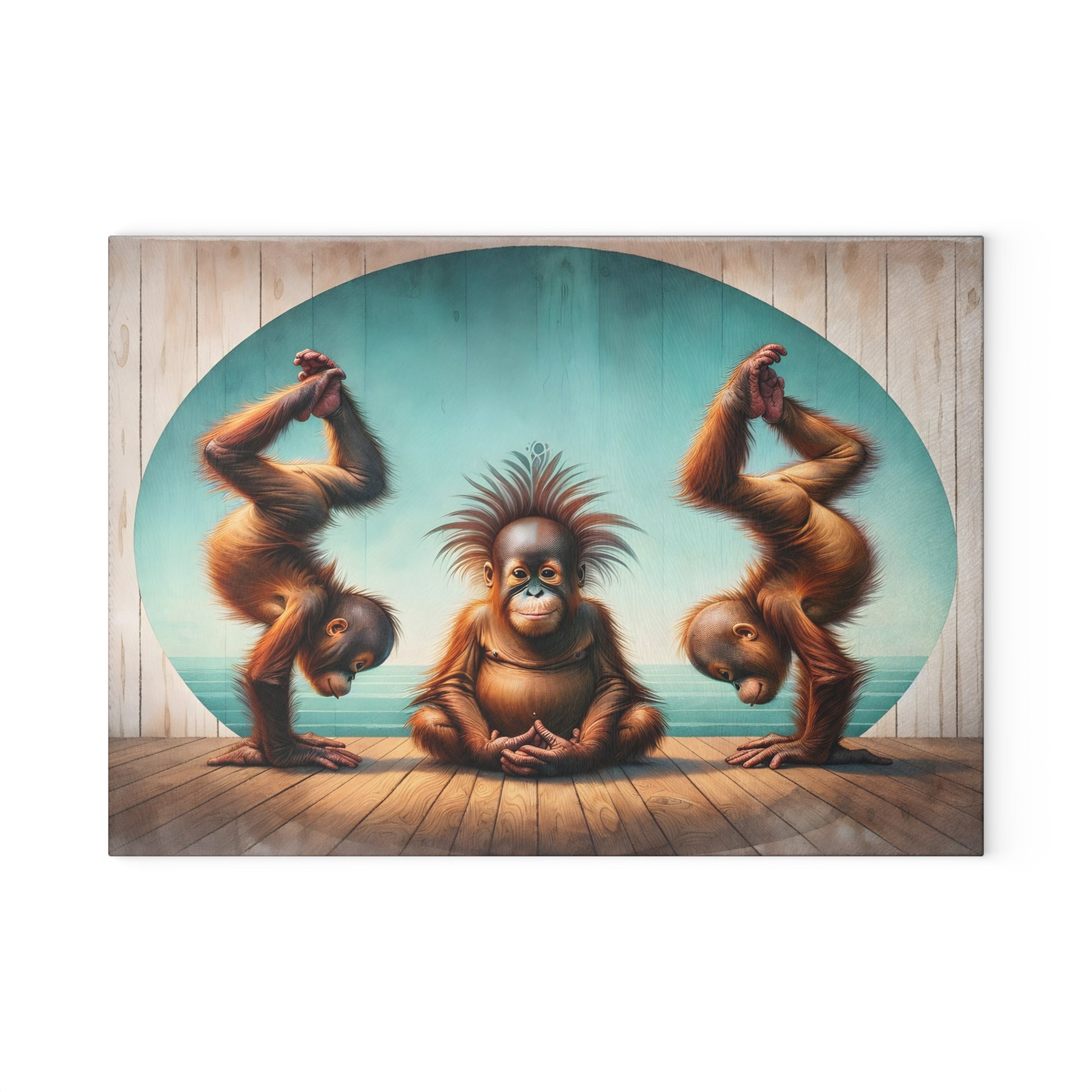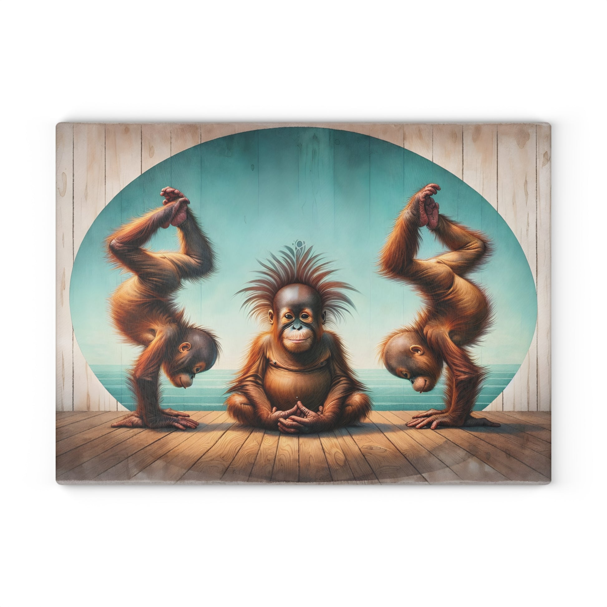 Bring a sense of calm, humor, and artistic charm into your kitchen with this playful orangutan yoga glass cutting board. Featuring three expressive orangutans posed in a peaceful meditation and yoga-inspired scene, this artwork blends whimsy with balance and mindfulness. Set against soft coastal tones and warm wood textures, the design creates a lighthearted yet soothing focal point that instantly sparks conversation.