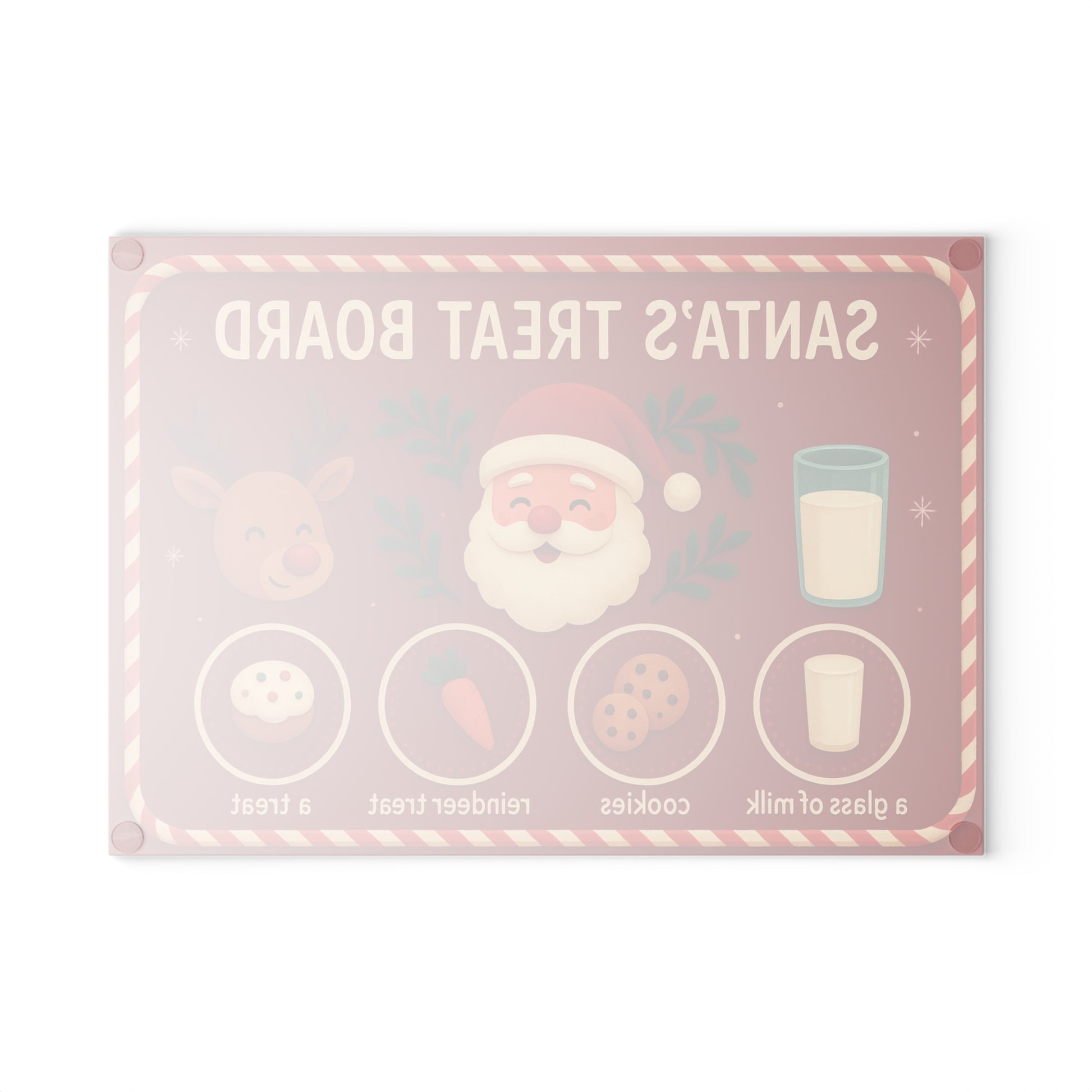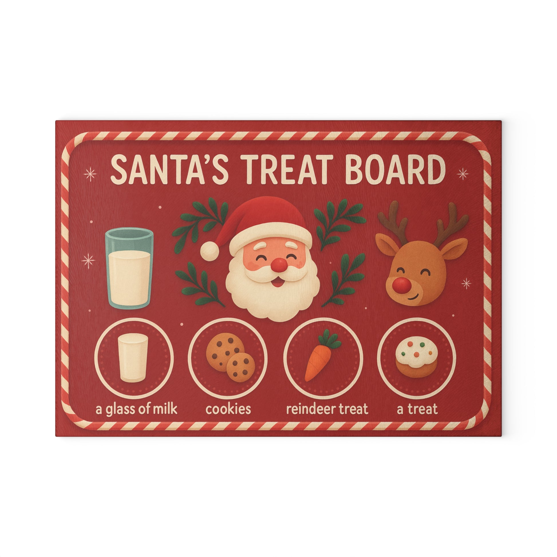 Bring a little magic to Christmas Eve with this adorable Santa’s Treat Board! Featuring a festive red background, Santa, Rudolph, milk, cookies, and holiday treats — this cheerful design turns your countertop into a heartwarming holiday tradition. Perfect for leaving snacks out on Christmas Eve or adding the sweetest seasonal touch to your kitchen décor.