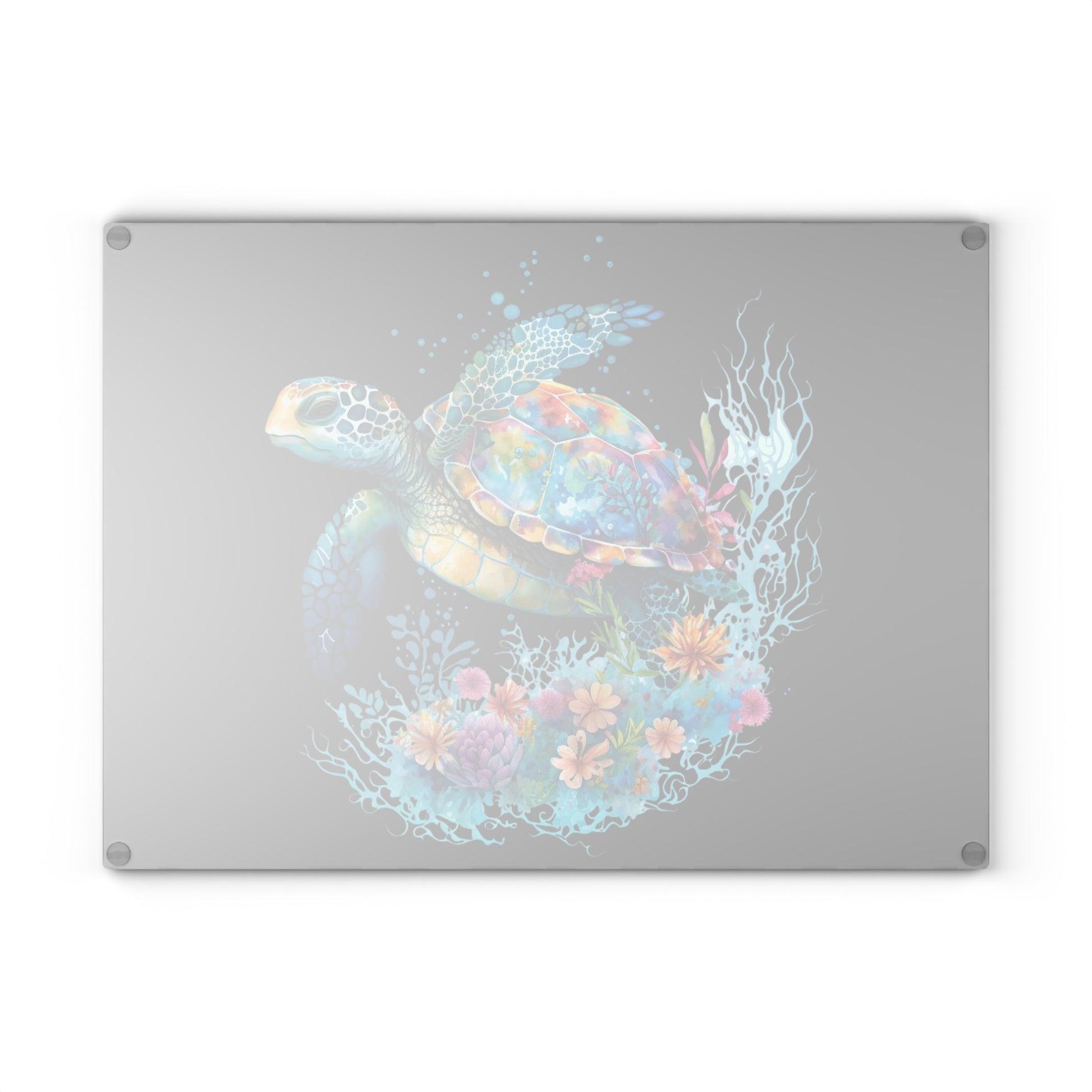 Add a splash of seaside serenity to your kitchen with this beautiful sea turtle glass cutting board. Featuring a graceful sea turtle swimming through tranquil turquoise waters, this board is perfect for those who love marine life, beachy vibes, or coastal décor. Whether you're prepping a summer meal or simply displaying it as a kitchen accent, this cutting board brings a touch of the ocean into your home.