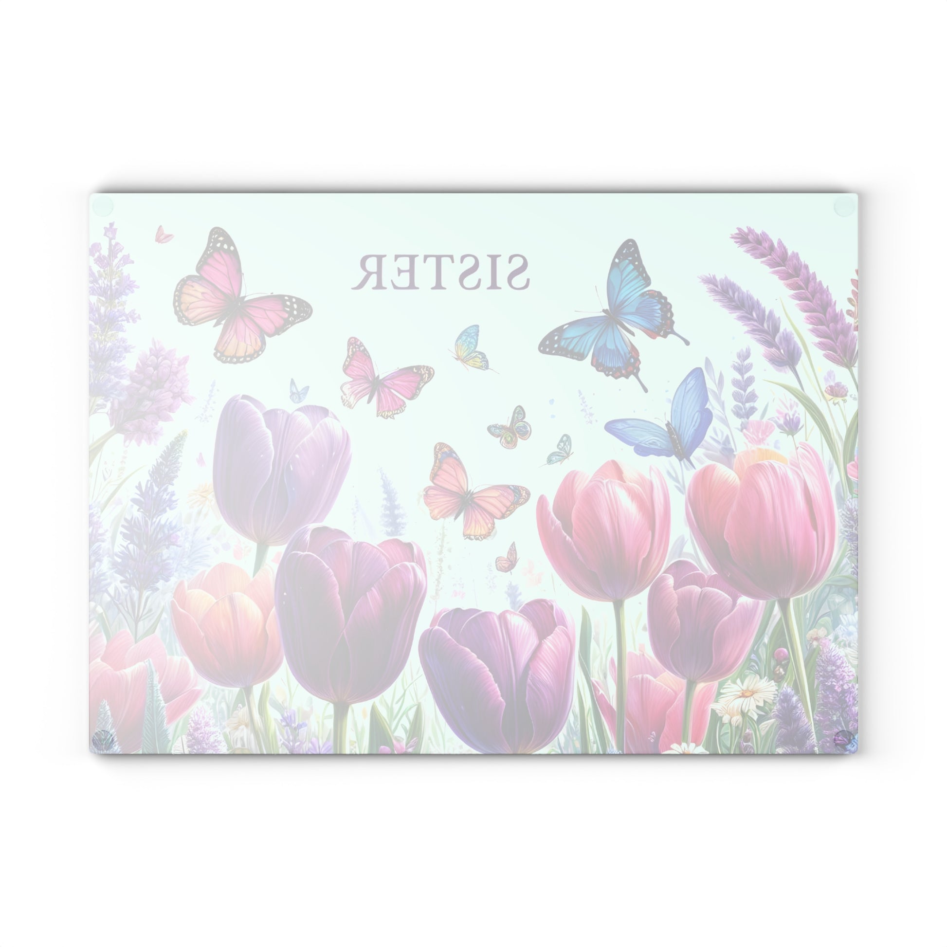Celebrate the beauty of sisterhood with our Sister Butterfly & Tulip tempered glass cutting board. This exquisite design features delicate pink and purple tulips surrounded by fluttering butterflies, creating a heartfelt piece perfect for gifting or brightening any kitchen space. Whether prepping dinner, serving a cheese platter, or displaying as functional art, this board is a timeless and versatile addition to any home.