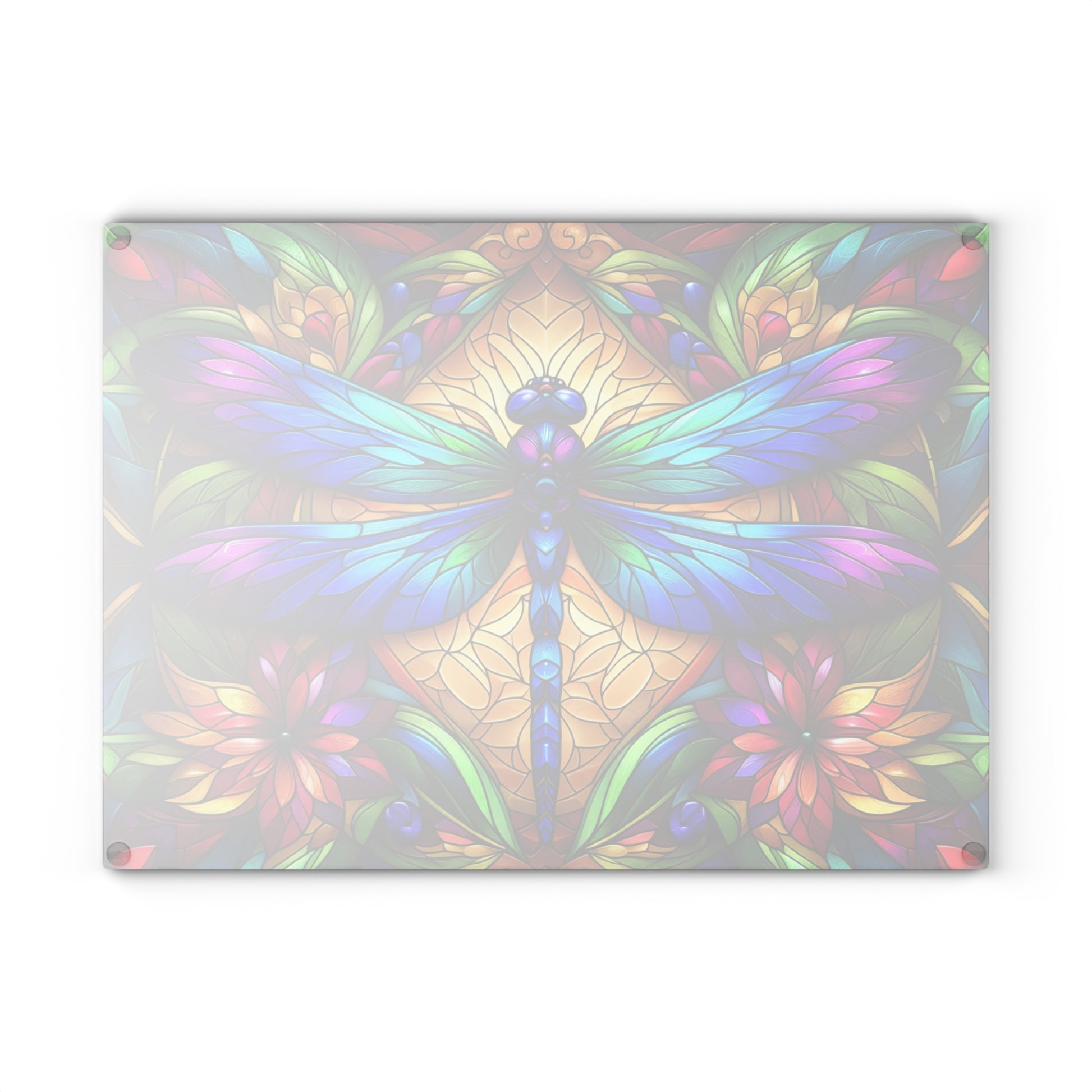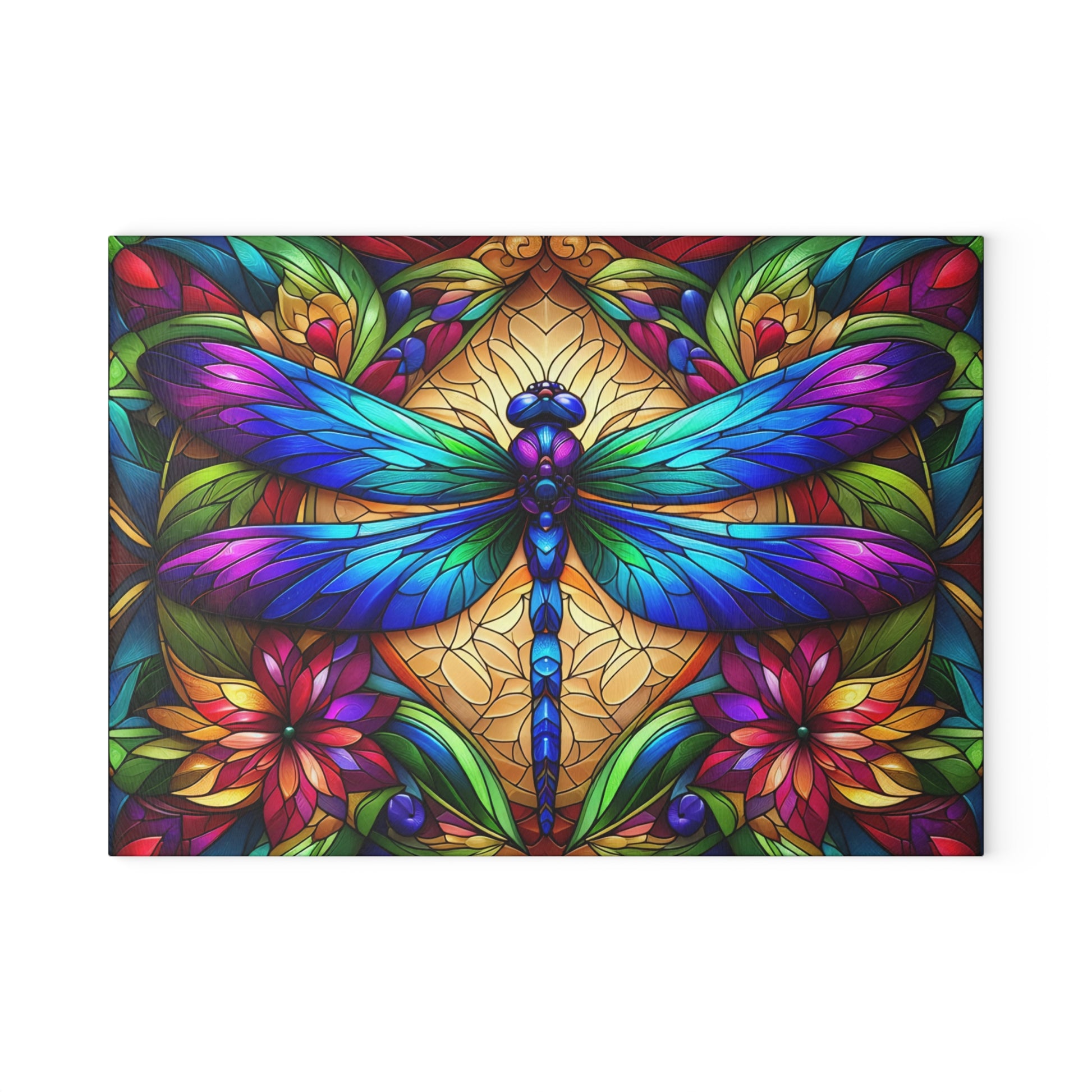 Bring vibrant elegance and artistic charm into your kitchen with this stained glass–style dragonfly glass cutting board. Featuring a brilliantly detailed dragonfly surrounded by richly colored florals and geometric patterns, this design mimics the look of handcrafted stained glass illuminated by light. The bold jewel tones and crisp black outlines create a striking visual that instantly elevates any kitchen, coffee bar, or countertop display.