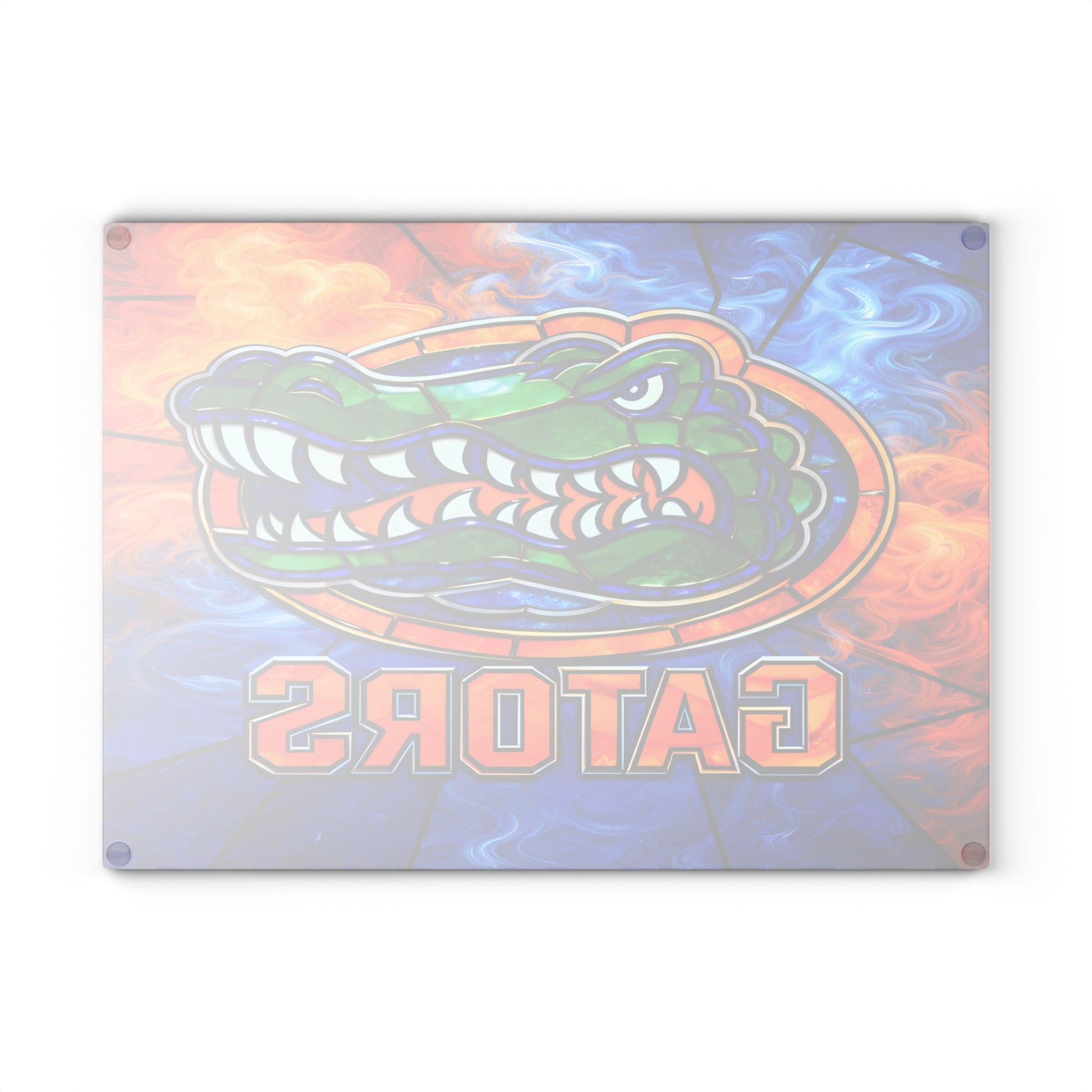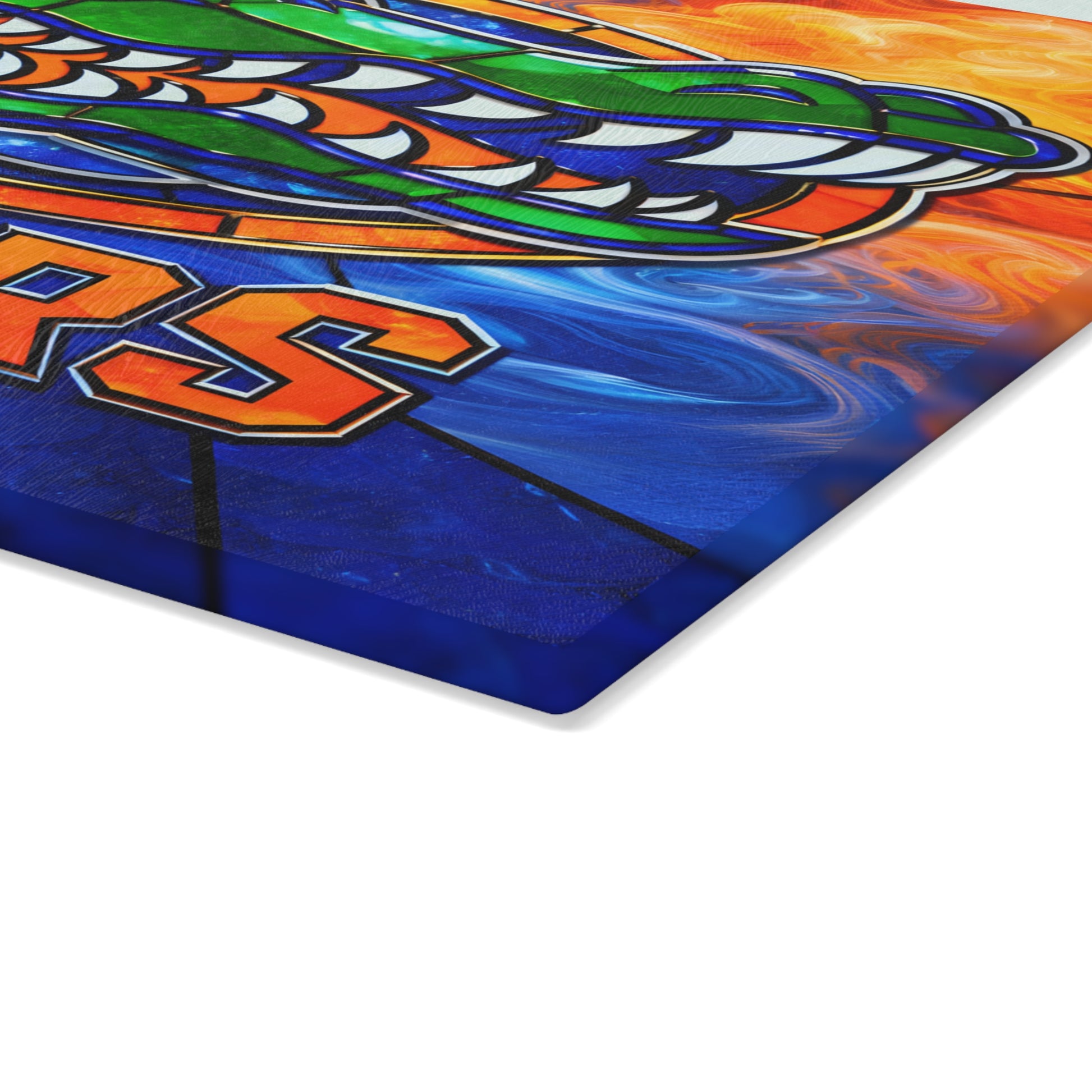 Make a striking statement in your kitchen with this dramatic glass cutting board featuring a bold reptile illustration rendered in a vibrant stained-glass style. Surrounded by swirling elements of fire and water, this design blends intense color, sharp detail, and artistic energy into a powerful visual centerpiece.