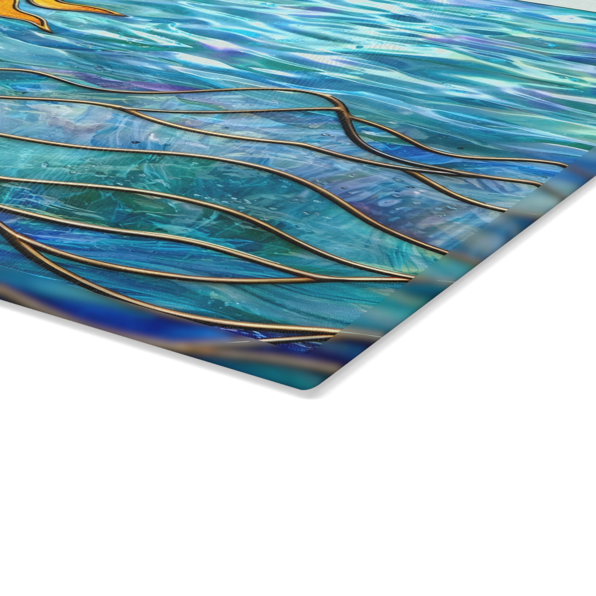 Bring calm movement and radiant color into your kitchen with this striking ocean-inspired glass cutting board. Featuring rolling blue waves layered with flowing golden lines and a glowing sun rising over the water, this artwork captures the peaceful rhythm of the sea. The luminous design adds depth, warmth, and visual interest, making it a beautiful accent for kitchens that lean coastal, modern, or art-focused.