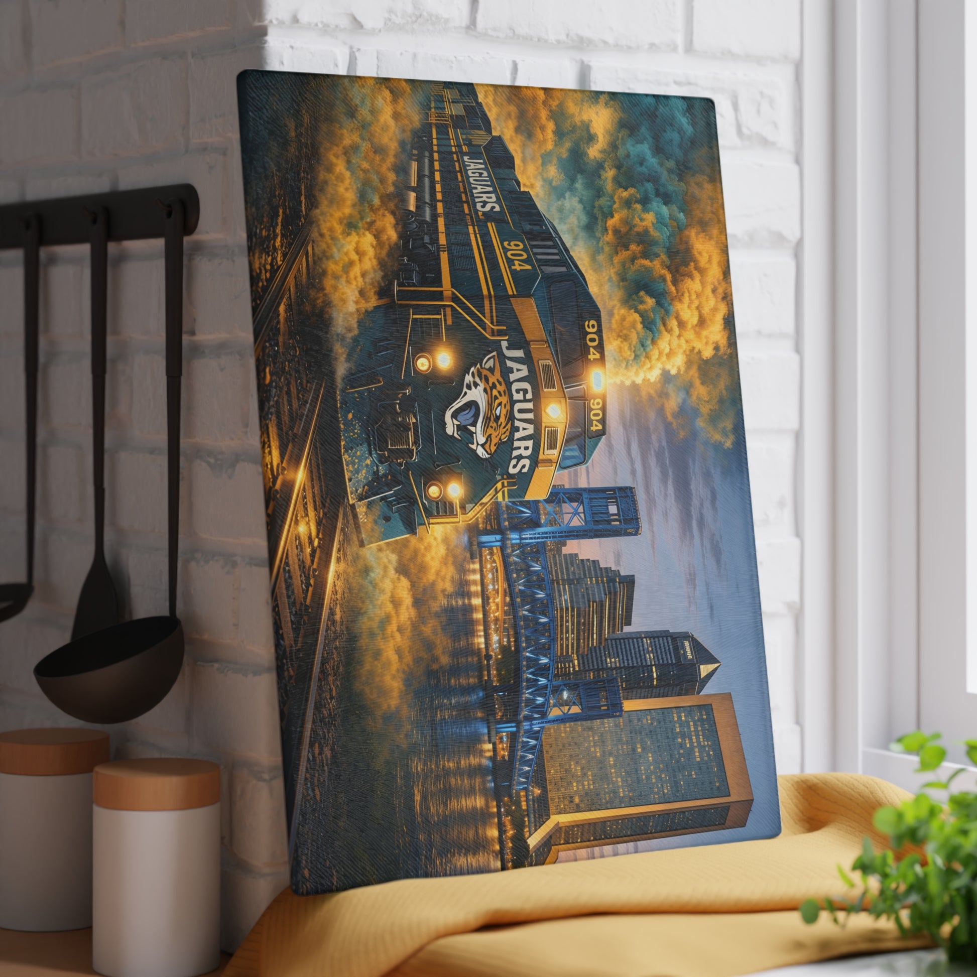 Teal & Gold Power Express Glass Cutting Board – Bold Train Art Kitchen Display