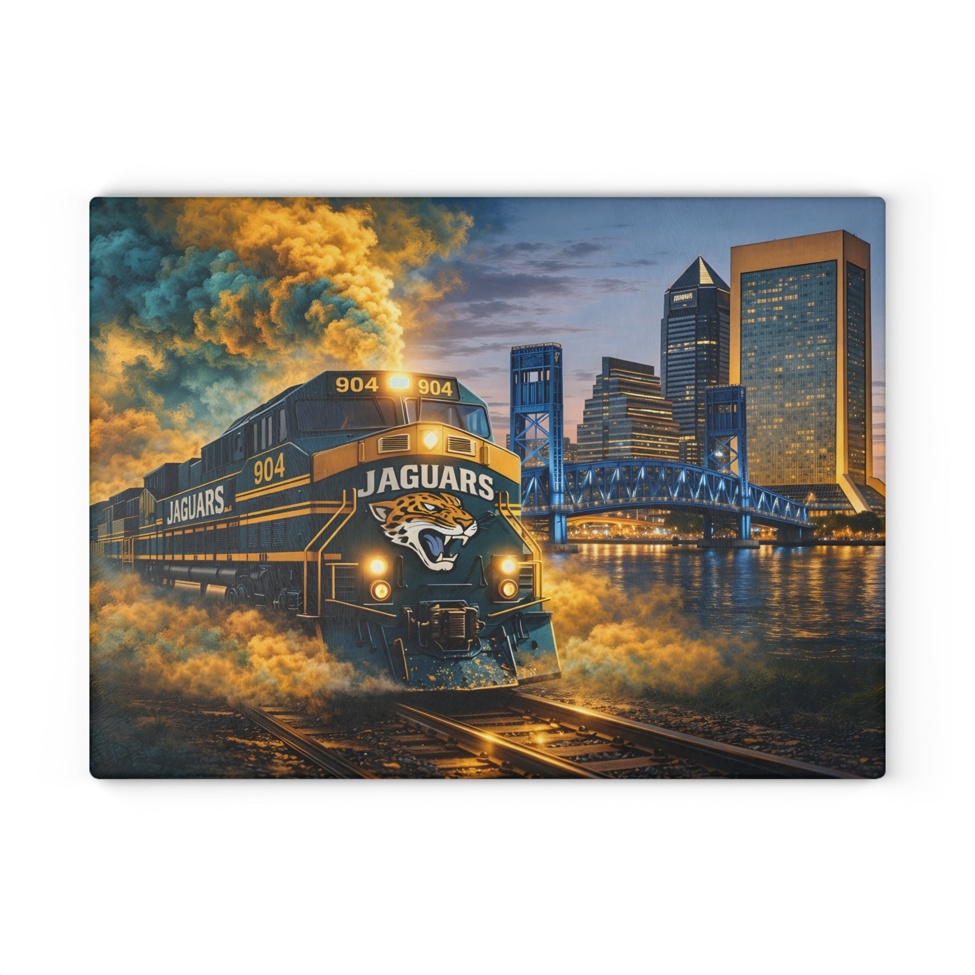 Add dramatic motion and modern edge to your kitchen with this Teal & Gold Power Express glass cutting board. Featuring a powerful locomotive racing forward through glowing smoke and light against a bold city skyline, this artwork captures strength, speed, and industrial style in a striking visual statement. Whether used for light food prep or displayed on your countertop, this piece brings energy and conversation to any space.