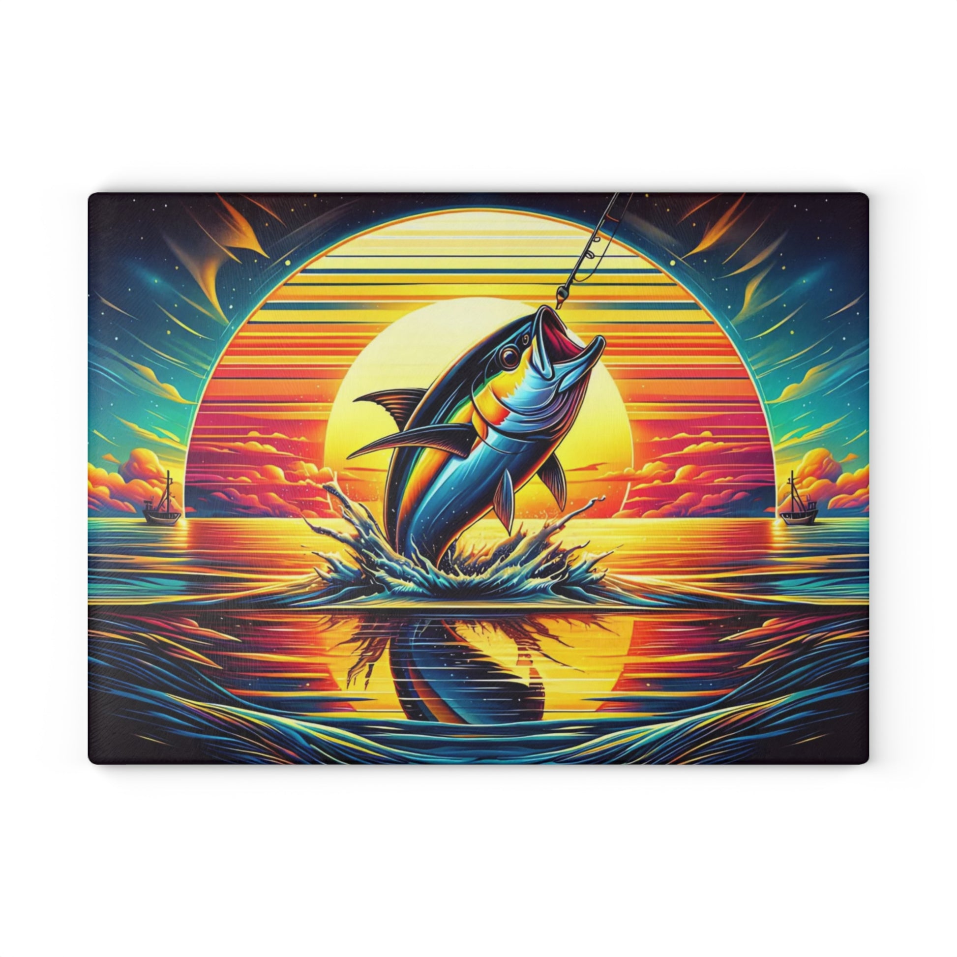 Vibrant Fishing Sunset Glass Cutting Board – Coastal Angler Kitchen Art