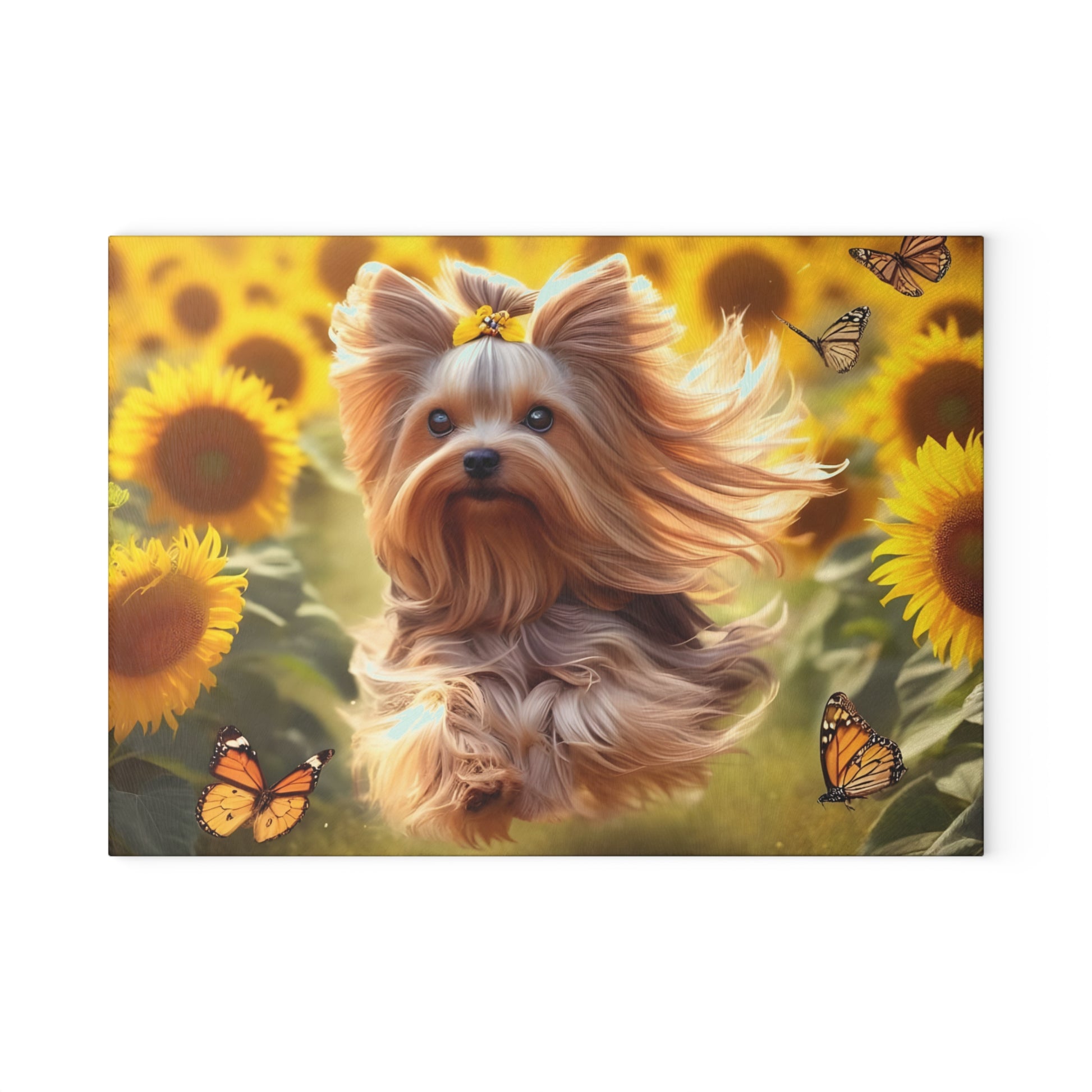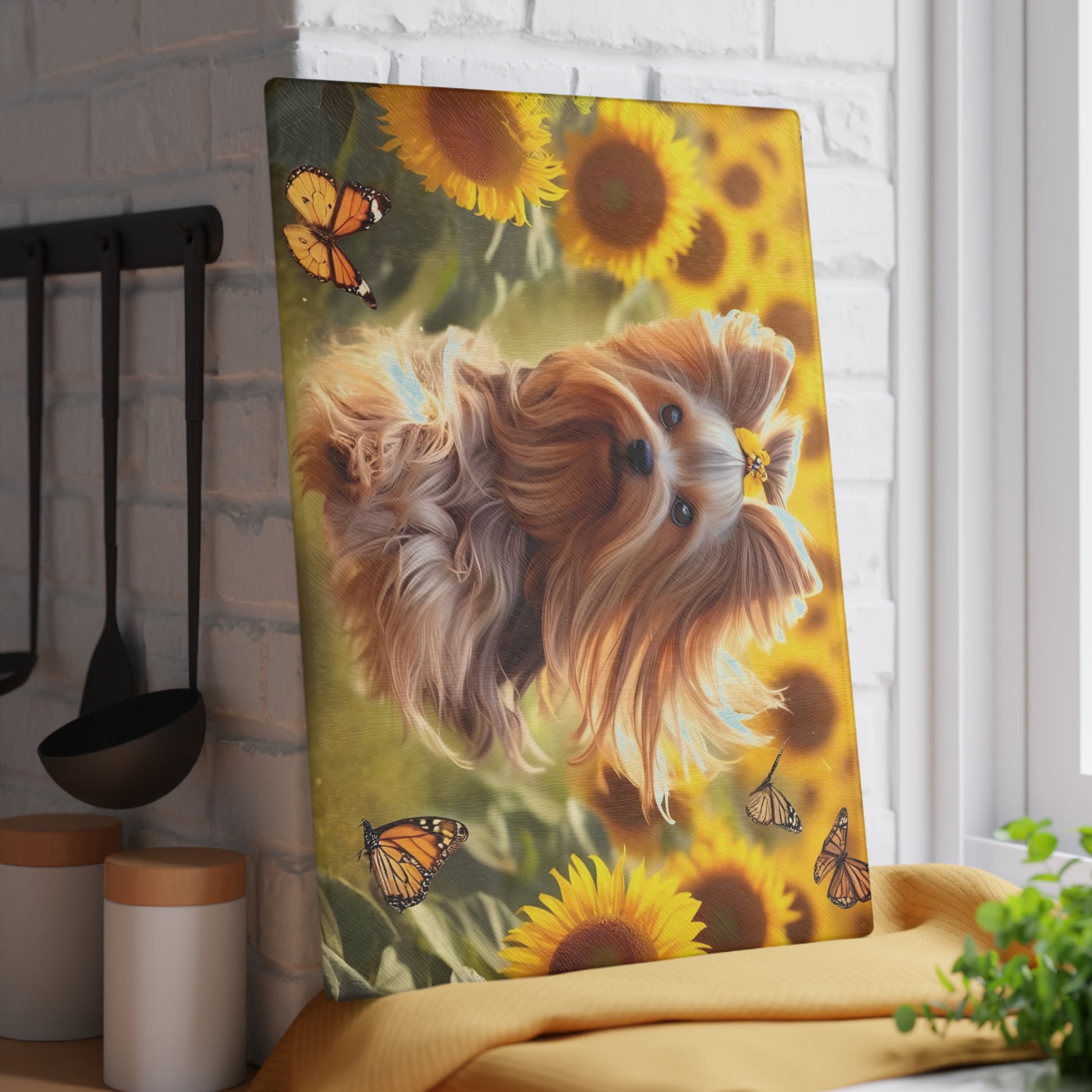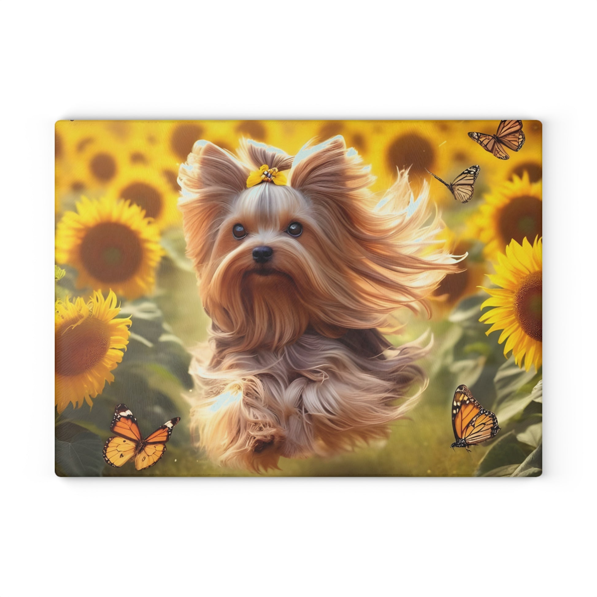Bring sunshine and tail wags to your kitchen with this adorable glass cutting board! Featuring a joyful Yorkie dashing through a golden field of sunflowers with a couple of butterflies fluttering by, this vibrant scene is sure to melt hearts and brighten any space.